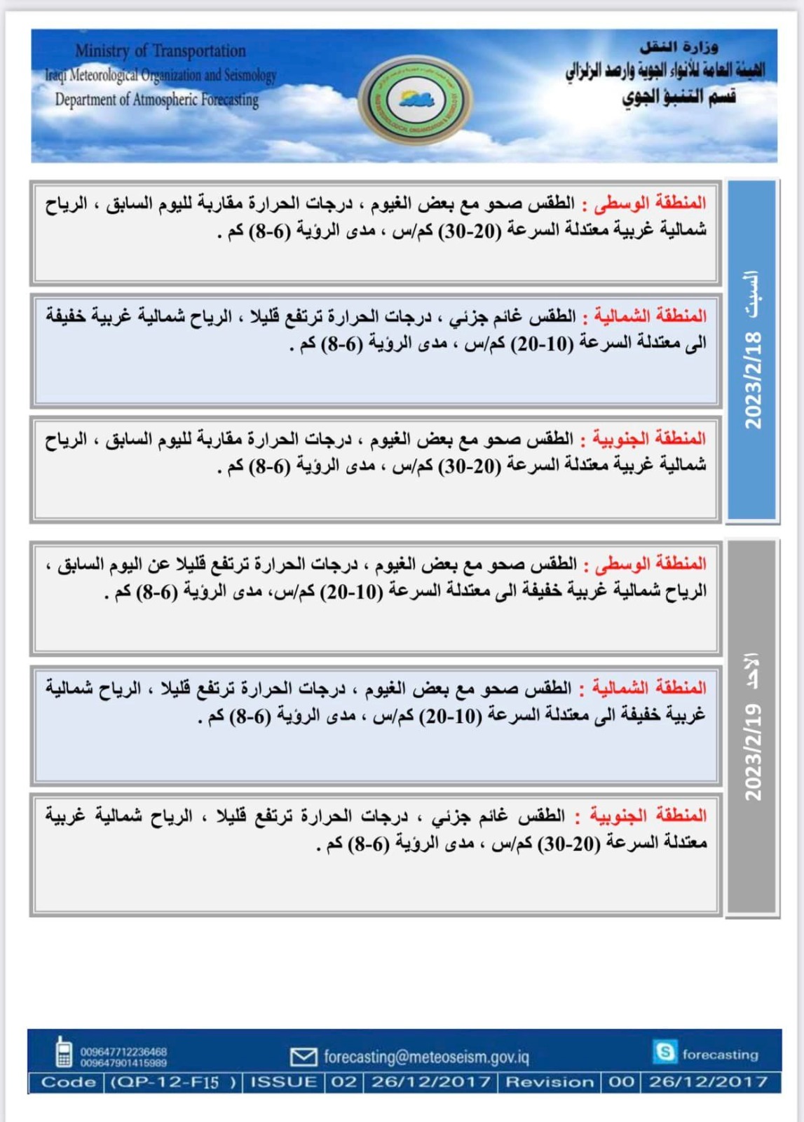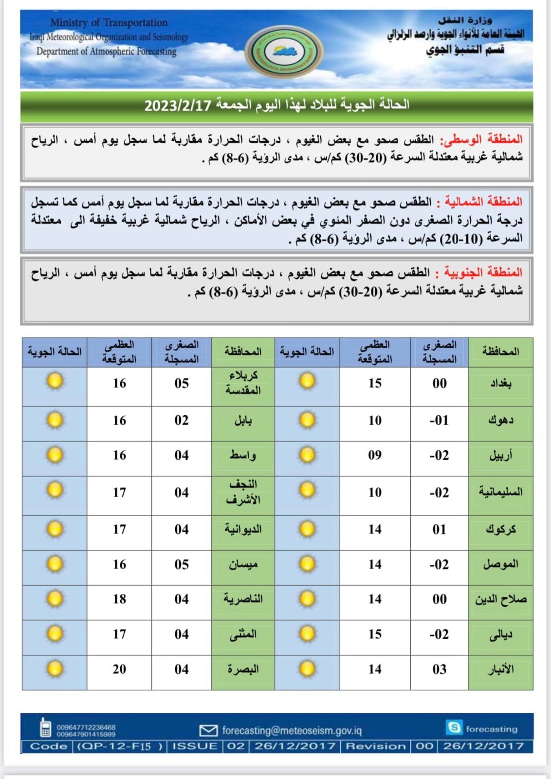 أعلنت هيئة الأنواء الجوية، الجمعة، حالة طقس العراق خلال الأيام المقبلة، فيما أشارت إلى ارتفاع بدرجات الحرارة وغيوم متفرقة.
