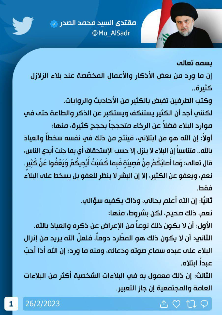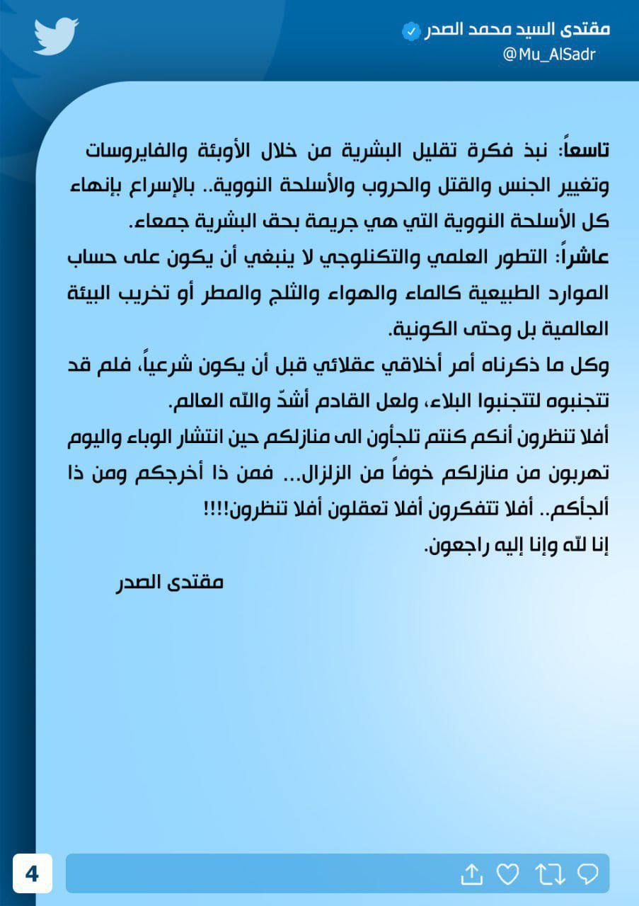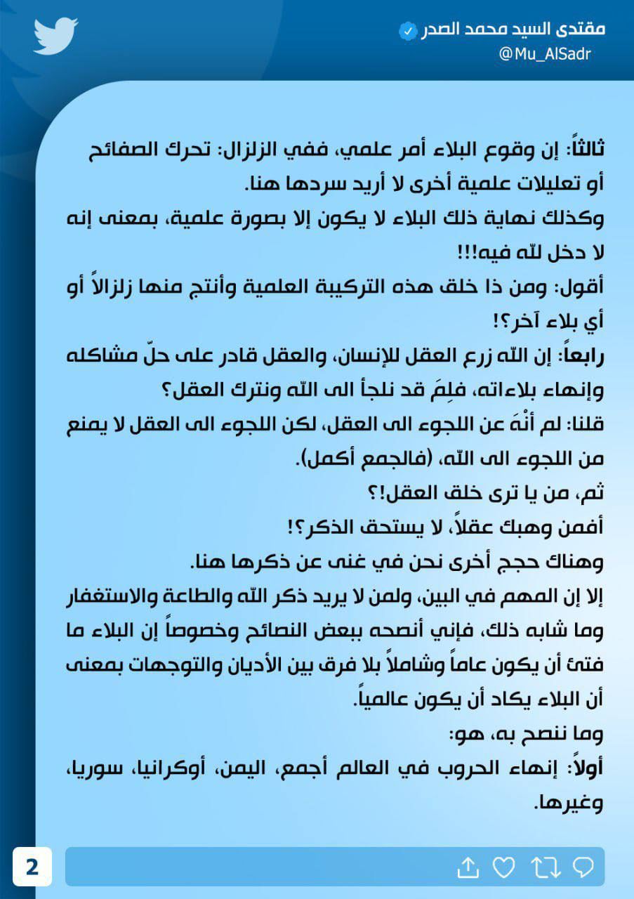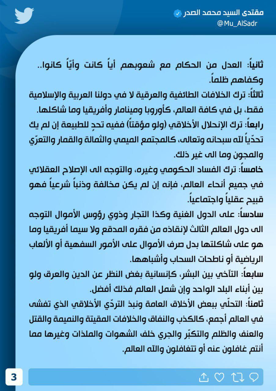 محلياتتغريدة جديدة للسيد الصدر قبل 3 سنوات 1 مشاهدة شارك السيد الصدر: لا يحق لأحد حمل شعار معاداة الطائفية وهو يعادي الاديان والعقائد تغريدة جديدة للسيد الصدر تغريدة جديدة للسيد الصدر تغريدة جديدة للسيد الصدر تغريدة جديدة للسيد الصدر الوسومالصدرقد يهمك أيضا أقتصاد نتنياهو يعلن رسميًا المصادقة على اتفاق الغاز مع مصر بقيمة 35 مليار دولار قبل 26 دقيقة 4 مشاهدات الاخبار العاجلة الخارجية: العراق ملتزم بتعزيز العلاقات مع الولايات المتحدة بما يسهم في بناء شراكة طويلة الامد قبل 42 دقيقة 4 مشاهدات سياسة العراق يرحب بالتصويت التاريخي للكونغرس على إلغاء تفويضي استخدام القوة العسكرية قبل 47 دقيقة 5 مشاهدات سياسة رئيس باكستان "آصف علي زرداري" يزور العراق الأسبوع المقبل قبل 54 دقيقة 5 مشاهدات محليات النجف تقرر تعطيل الدوام الرسمي للمدارس فقط يوم غدٍ الخميس بسبب سوء الأحوال الجوية قبل ساعة واحدة 4 مشاهدات