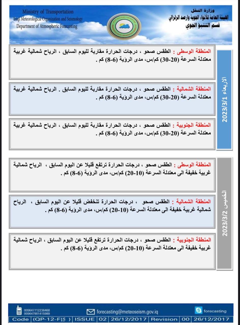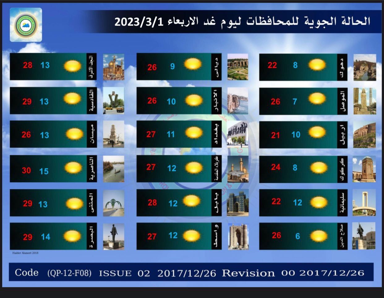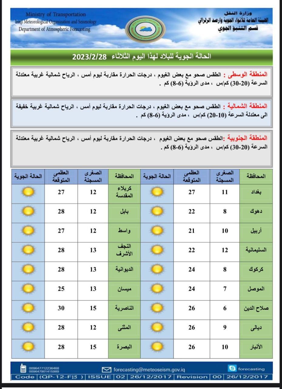 أعلنت هيئة الأنواء الجوية، الثلاثاء، عن حالة الطقس في البلاد للأيام المقبلة، فيما توقعت تساقطاً للأمطار وارتفاعاً جديداً في درجات الحرارة.