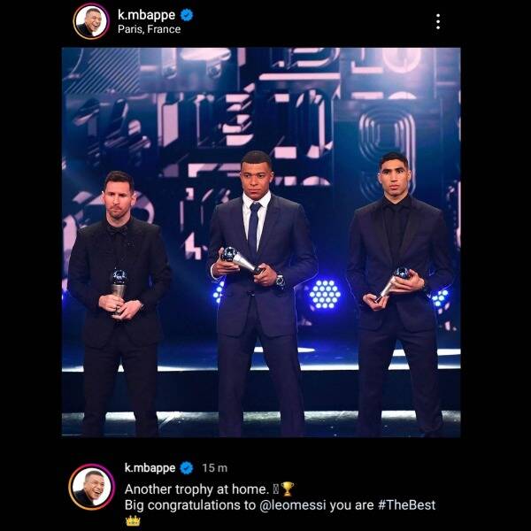 ونشر مبابي، عبر حسابه على إنستجرام، صورة له مع ميسي، وأشرف حكيمي من الحفل، وكتب عليها “كأس آخر في المنزل.. تهانينا إلى ليونيل ميسي.. أنت الأفضل”.