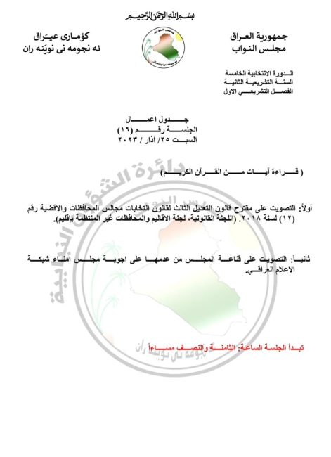 سياسةبالوثيقة.. جدول أعمال جلسة البرلمان ليوم السبت المقبل قبل 3 سنوات 3 مشاهدات شارك مجلس النواب يصوت على اجراء انتخابات مجالس المحافظات في الـ6 من تشرين الثانيبالوثيقة.. جدول أعمال جلسة البرلمان ليوم السبت المقبل الوسومالبرلمانقد يهمك أيضا سياسة المجلس السياسي الوطني يعلن الاتفاق على آليات تسهل حسم اختيار رئيس مجلس النواب قبل 5 ساعات 10 مشاهدات الحكم الرابع الـVAR يتلاعب بدورينا .. تفاصيل صادمة في الحكم الرابع قبل 5 ساعات 10 مشاهدات عربي ودولي الحكومة الليبية تعلن مقتل رئيس الأركان محمد الحداد ومرافقيه اثر تحطم طائرتهم في أنقرة قبل 5 ساعات 19 مشاهدات عربي ودولي مقتل رئيس الأركان الليبي "محمد الحداد" ومرافقيه بتحطم طائرتهم أثناء عودتهم من أنقرة قبل 5 ساعات 16 مشاهدات عربي ودولي وسائل إعلام تركية: العثور على حطام طائرة رئيس الاركان الليبي التي سقطت بعد إقلاعها من أنقرة قبل 5 ساعات 9 مشاهدات