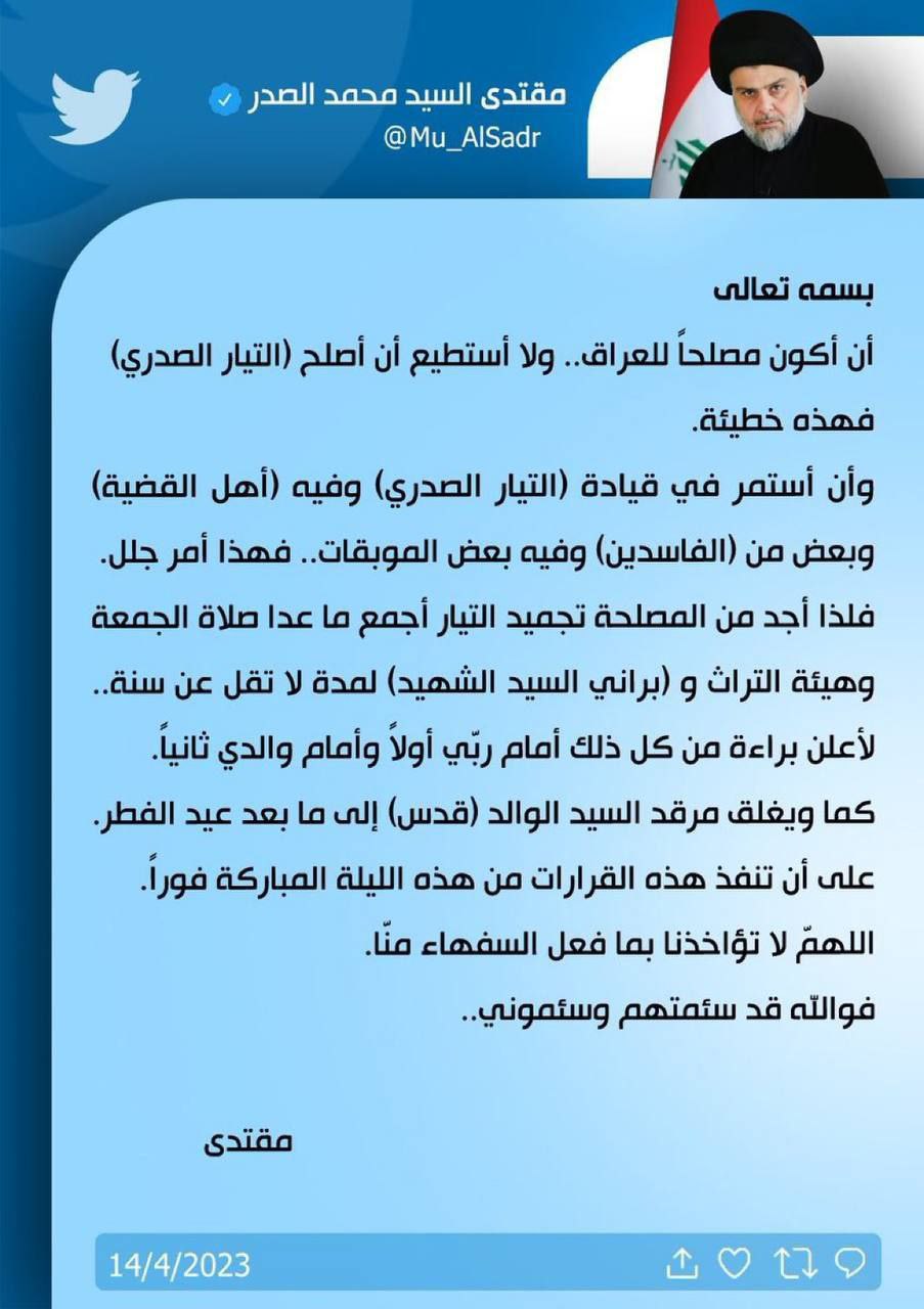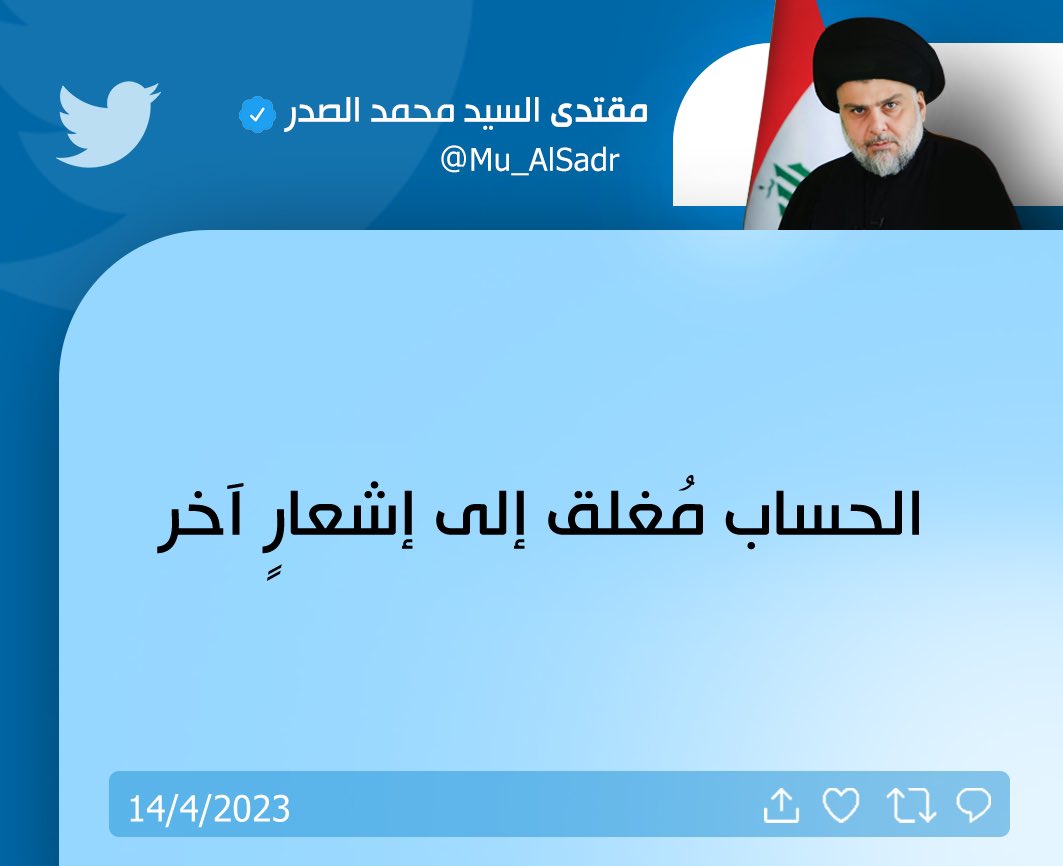 سياسةالسيد الصدر يعلن تجميد التيار الصدري لمدة عام واغلاق حسابه في تويتر الى اشعار اخر قبل 3 سنوات 2 مشاهدات شارك السيد الصدر يعلن تجميد التيار الصدري لمدة عام واغلاق حسابه في تويتر الى اشعار اخر السيد الصدر يعلن تجميد التيار الصدري لمدة عام واغلاق حسابه في تويتر الى اشعار اخر السيد الصدر يعلن تجميد التيار الصدري لمدة عام واغلاق حسابه في تويتر الى اشعار اخر الوسومالصدرقد يهمك أيضا أقتصاد نتنياهو يعلن رسميًا المصادقة على اتفاق الغاز مع مصر بقيمة 35 مليار دولار قبل 25 دقيقة 4 مشاهدات الاخبار العاجلة الخارجية: العراق ملتزم بتعزيز العلاقات مع الولايات المتحدة بما يسهم في بناء شراكة طويلة الامد قبل 42 دقيقة 4 مشاهدات سياسة العراق يرحب بالتصويت التاريخي للكونغرس على إلغاء تفويضي استخدام القوة العسكرية قبل 47 دقيقة 5 مشاهدات سياسة رئيس باكستان "آصف علي زرداري" يزور العراق الأسبوع المقبل قبل 53 دقيقة 5 مشاهدات محليات النجف تقرر تعطيل الدوام الرسمي للمدارس فقط يوم غدٍ الخميس بسبب سوء الأحوال الجوية قبل ساعة واحدة 4 مشاهدات