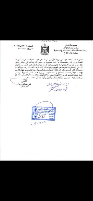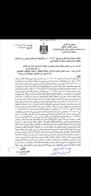 وبحسب وثائق الحكم، فان"المحكمة ردت دعوى الجبوري بحق رئيس مجلس النواب محمد الحلبوسي".