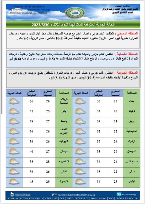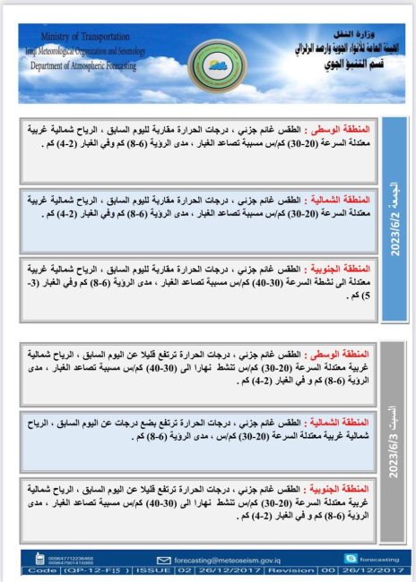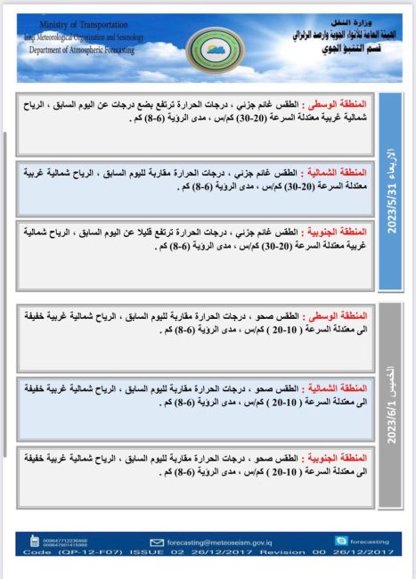 أعلنت هيئة الأنواء الجوية، اليوم الثلاثاء، عن حالة الطقس في البلاد للأيام المقبلة، فيما توقعت تصاعداً للغبار وارتفاعاً في درجات الحرارة.