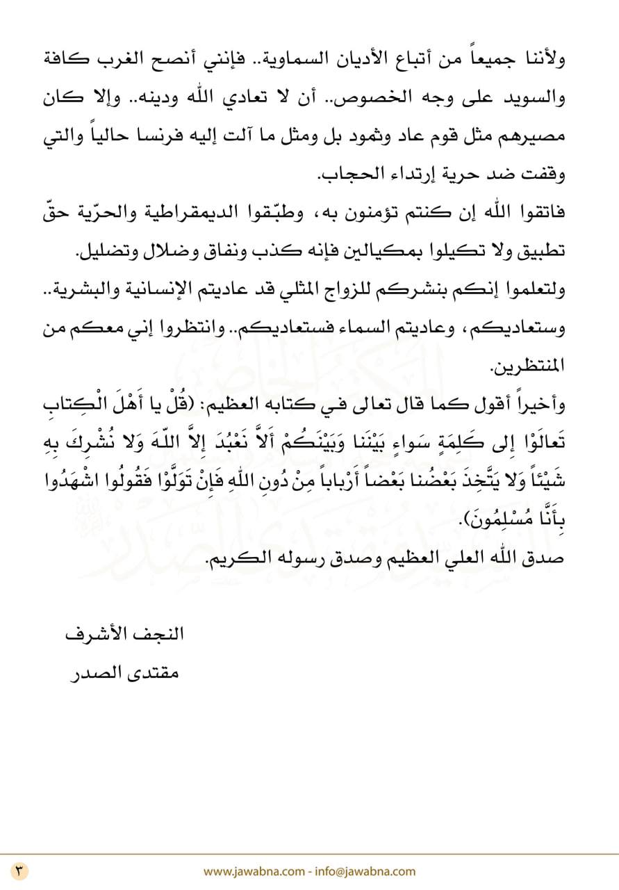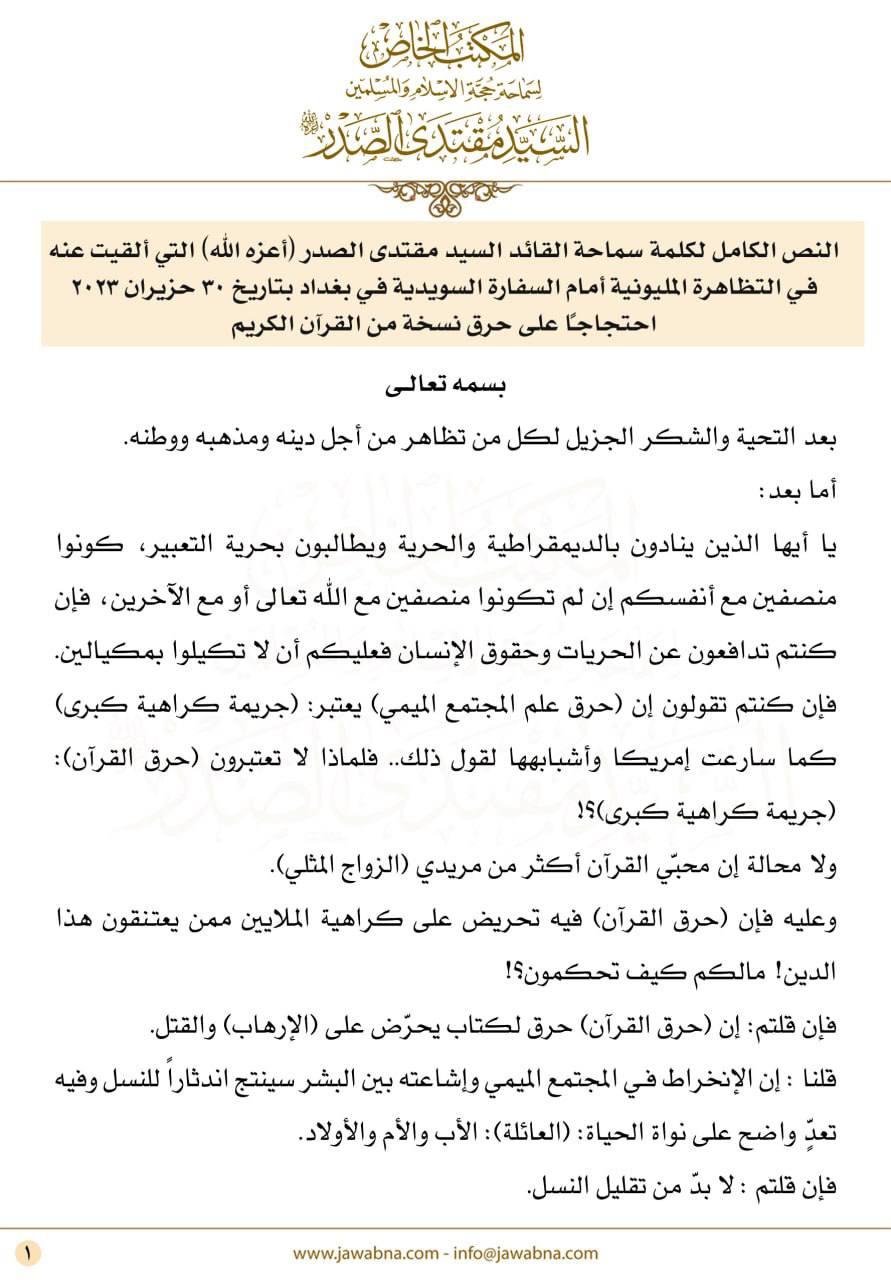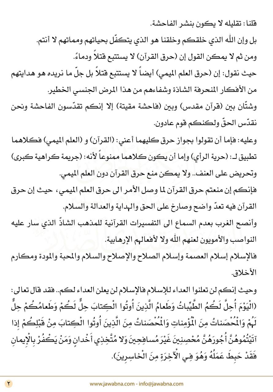 محلياتكلمة السيد الصدر: حرق القرآن فيه تحريض على كراهية الملايين من المسلمين قبل سنتين 6 مشاهدات شارك كلمة السيد الصدر: حرق القرآن الكريم تعدٍ صارخ على الهداية والعدالة والسلام كلمة السيد الصدر: حرق القرآن الكريم تعدٍ صارخ على الهداية والعدالة والسلام كلمة السيد الصدر: حرق القرآن الكريم تعدٍ صارخ على الهداية والعدالة والسلام قائمة الصور 1/3 كلمة السيد الصدر: حرق القرآن الكريم تعدٍ صارخ على الهداية والعدالة والسلام كلمة السيد الصدر: حرق القرآن الكريم تعدٍ صارخ على الهداية والعدالة والسلام كلمة السيد الصدر: حرق القرآن الكريم تعدٍ صارخ على الهداية والعدالة والسلام الوسومالصدرالقرآن الكريمحرق القرآن الكريمقد يهمك أيضا محليات الصحة: نصف النزلاء في مستشفى الرشاد متماثلون للشفاء لكن ذويهم يرفضون استلامهم قبل دقيقتان 2 مشاهدات عربي ودولي مقربون يكشفون: بشار الأسد تأقلم واستسلم للمنفى وشقيقه ماهر لم يتقبل فكرة فقدان السلطة قبل 6 دقائق 2 مشاهدات عربي ودولي برّي يحذر من استمرار العدوان الإسرائيلي: لا يجوز ومن غير المقبول التفاوض تحت النار قبل 21 دقيقة 5 مشاهدات رياضة أيمن حسين: نتطلع إلى تقديم مستوى طيب أمام المنتخب السوداني قبل 38 دقيقة 8 مشاهدات عربي ودولي البنتاجون يطلب أكثر من 300 ألف طائرة مسيرة صغيرة عام 2028 قبل 43 دقيقة 6 مشاهدات