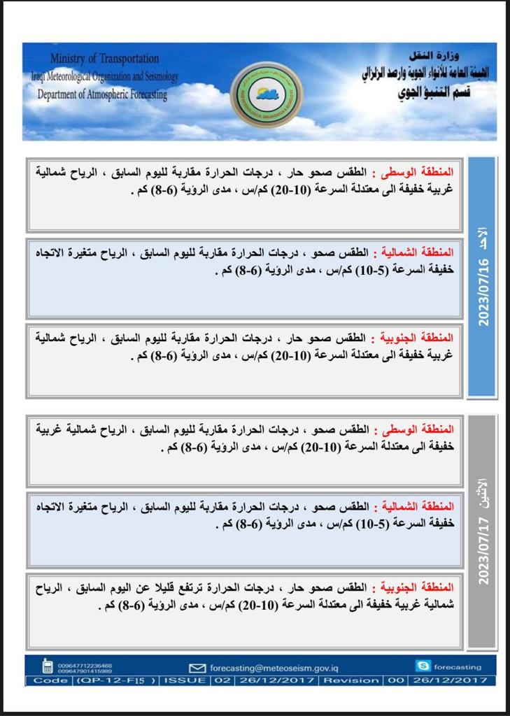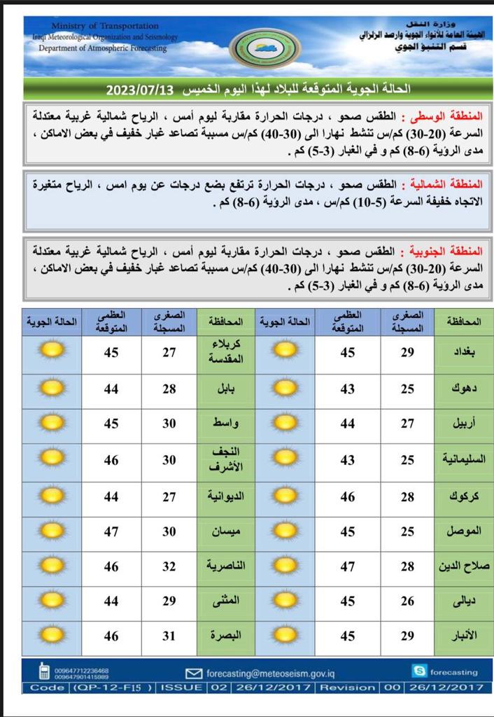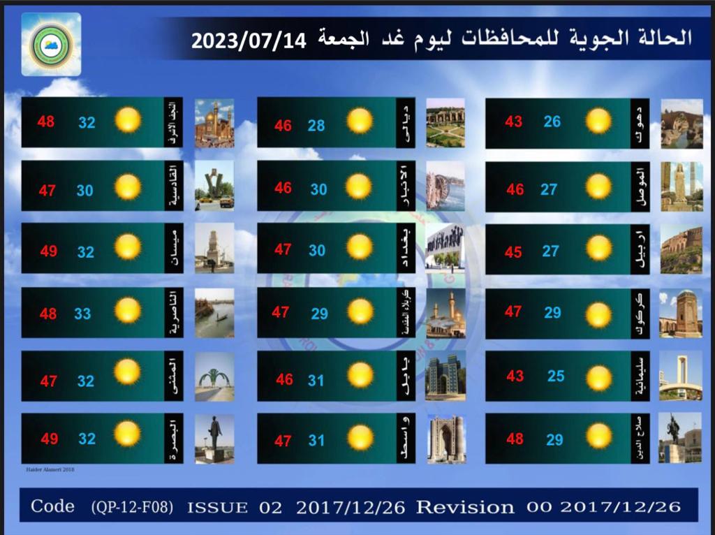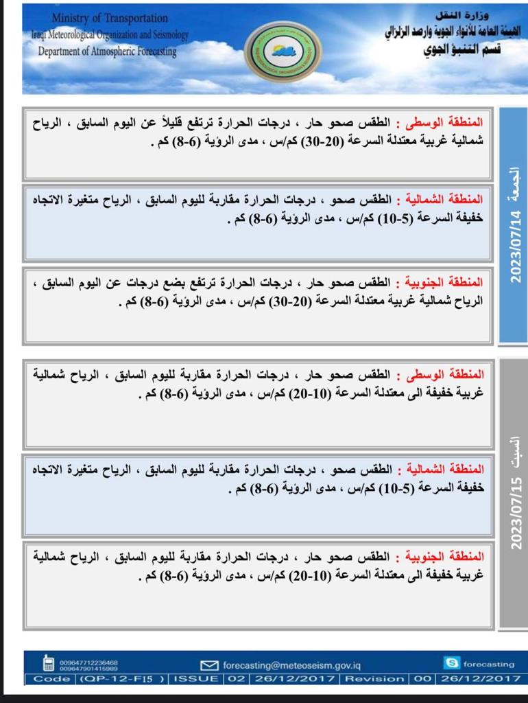 أعلنت هيئة الأنواء الجوية، حالة طقس العراق خلال الأيام المقبلة، فيما أشارت إلى ارتفاع درجات الحرارة.