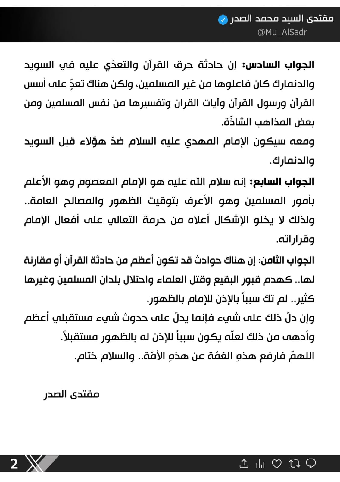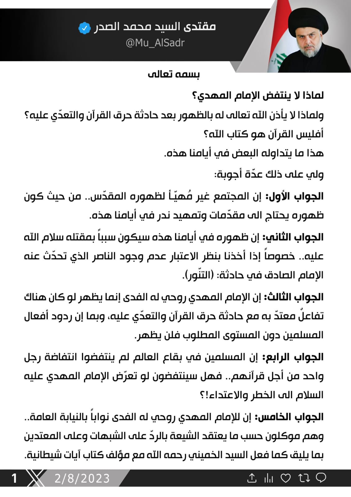 سياسةتغريدة جديدة للسيد الصدر قبل سنتين 5 مشاهدات شارك تغريدة جديدة للسيد الصدر تغريدة جديدة للسيد الصدر الوسومالصدرقد يهمك أيضا محليات مفوضية الانتخابات تطلق استمارة طلبات تشكيل إقليم البصرة قبل 3 ساعات 20 مشاهدات الحكم الرابع كواليس الصراعات داخل اتحاد الكرة اليوم في الحكم الرابع قبل 3 ساعات 8 مشاهدات عربي ودولي القيادة الوسطى الأمريكية: قتلنا 14 إرهابيًا من داعش واعتقلنا 119 خلال الشهور الستة الماضية قبل 3 ساعات 10 مشاهدات سياسة الرئيس الحلبوسي يؤكد على اعضاء كتلة "تقدم" ان يكونوا قدر المسؤولية بالحفاظ على الاستحقاقات قبل 4 ساعات 8 مشاهدات عربي ودولي الصحة العالمية: مقتل أكثر من 1600 شخص خلال هجمات على المراكز الصحية في السودان قبل 4 ساعات 6 مشاهدات