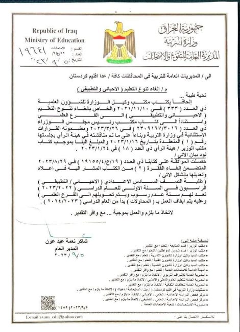 وذكرت الوزارة، في بيان تلقته “الرشيد”، إنه “تقرر إلغاء تنوع التعليم (الاحيائي والتطبيقي) بدءاً من العام 2023 -2024، واعتبار العام الدراسي 2022-2023، سنة عدم رسوب لطلبة الصف السادس الإعدادي (الاحيائي والتطبيقي)”.
