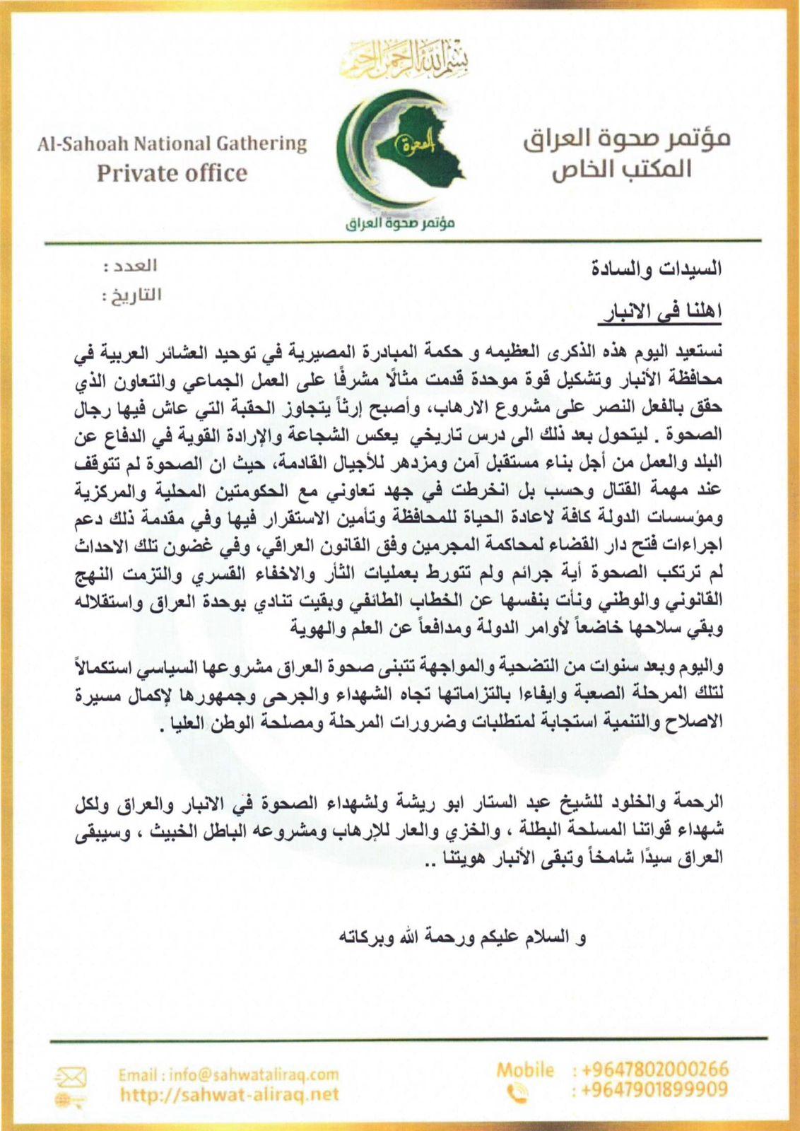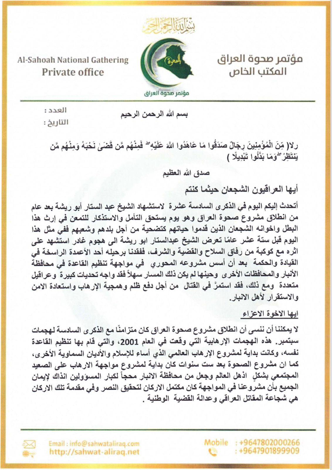 قراءة: مؤتمر صحوة العراق يصدر بياناً في الذكرى الـ16 لاستشهاد الشيخ عبد الستار ابو ريشة