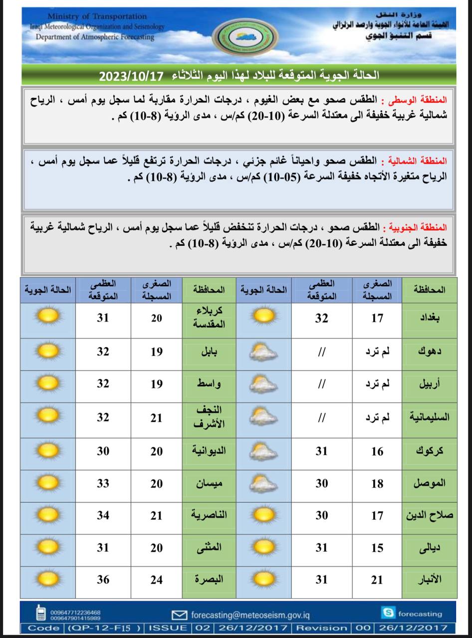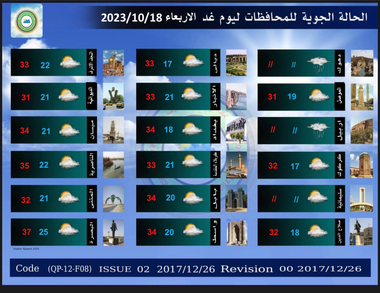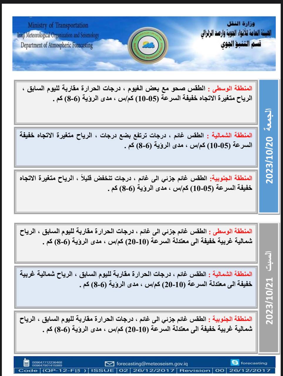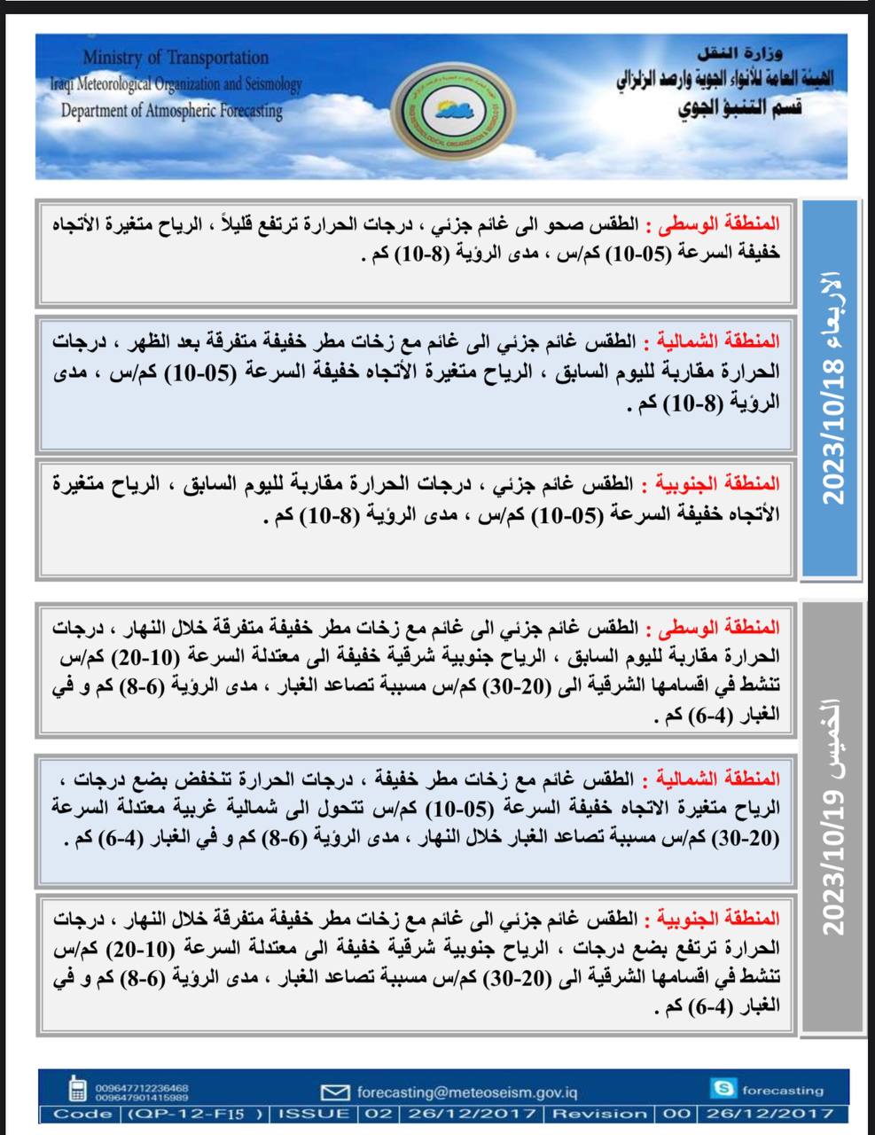أعلنت هيئة الأنواء الجوية، حالة طقس العراق خلال الأيام المقبلة، فيما أشارت إلى أمطار خفيفة وتصاعد للغبار,