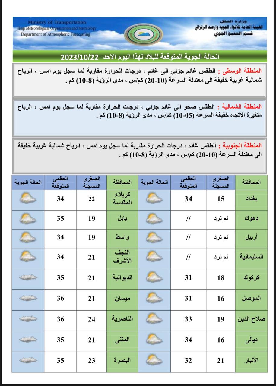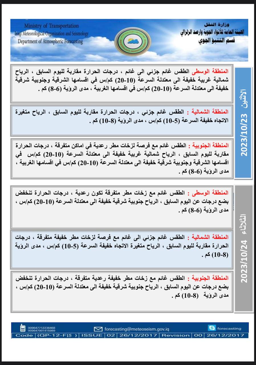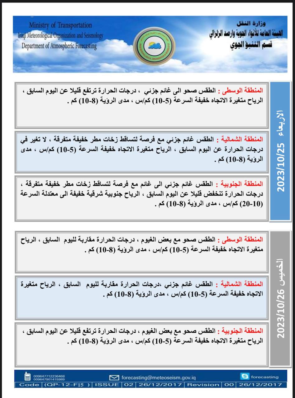 أعلنت هيئة الأنواء الجوية، حالة طقس العراق خلال الأيام المقبلة، فيما أشارت إلى أمطار رعدية وارتفاع بدرجات الحرارة.