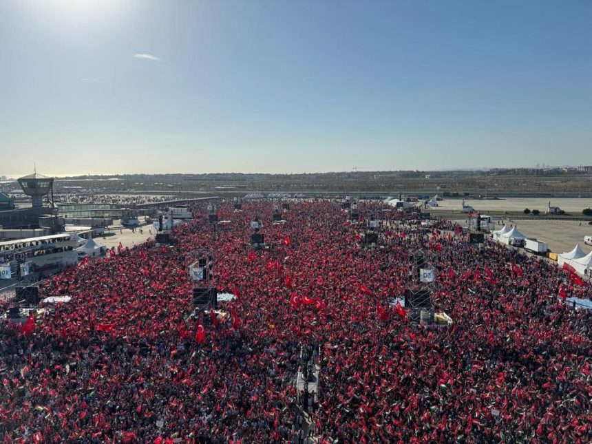 وألقى الرئيس رجب طيب أردوغان كلمة المظاهرة ندّد فيها بـ"المجازر" التي ترتكبها إسرائيل في غزة، وجدد فيها تأكيده أن حركة المقاومة الإسلامية (حماس) ليست إرهابية، برغم انزعاج تل أبيب من تصريحه الأخير بهذا الخصوص، وفق تعبيره.