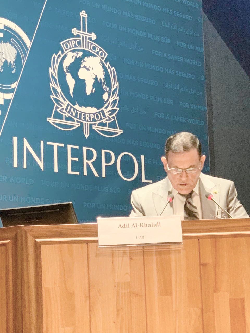 واضاف، ان “الخالدي القى كلمة العراق خلال المؤتمر نقل فيها تحيات القائد العام للقوات المسلحة ووزير الداخلية الى رئيس واعضاء المنظمة والدول المشاركة، مستعرضاً اهم الانجازات التي قامت بها وزارة الداخلية العراقية والخطط الاستراتيجية الرامية الى تعزيز الامن الداخلي والتعاون المشترك مع الدول الاعضاء من اجل السلم والامن العالمي وتسليط الضوء على التشريعات الوطنية النافذة لمكافحة الجرائم التي تشكل تهديداً على الامن ومنها مكافحة الارهاب و المخدرات والاتجار بالبشر والجريمة المنظمة والحدود”.