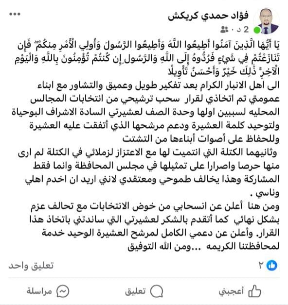 سياسةانسحاب المرشح فؤاد حمدي كريكش من تحالف عزم في الانبار قبل سنتين 12 مشاهدات شارك انسحاب المرشح فؤاد حمدي كريكش من تحالف عزم في الانبارانسحاب المرشح فؤاد حمدي كريكش من تحالف عزم في الانبار الوسومفؤاد حمدي كريكشقد يهمك أيضا رياضة عرض رسمي لشراء يوفنتوس والملاك يرفضوه قبل 3 دقائق 2 مشاهدات عربي ودولي بريطانيا تحذر أوروبا: شبح الحرب يطرق الأبواب قبل 26 دقيقة 5 مشاهدات أقتصاد خلال 11 شهراً.. العراق يستورد سلعاً من تركيا بقيمة (9.3) مليارات دولار قبل 42 دقيقة 4 مشاهدات أمن الاستخبارات العسكرية تحبط عملية لتهريب المشتقات النفطية وتعتقل منفذيها في نينوى قبل ساعة واحدة 7 مشاهدات سياسة غوتيريش يصل بغداد للمشاركة في مراسم الإعلان الرسمي لانتهاء أعمال ولاية (اليونامي) قبل ساعة واحدة 11 مشاهدات
