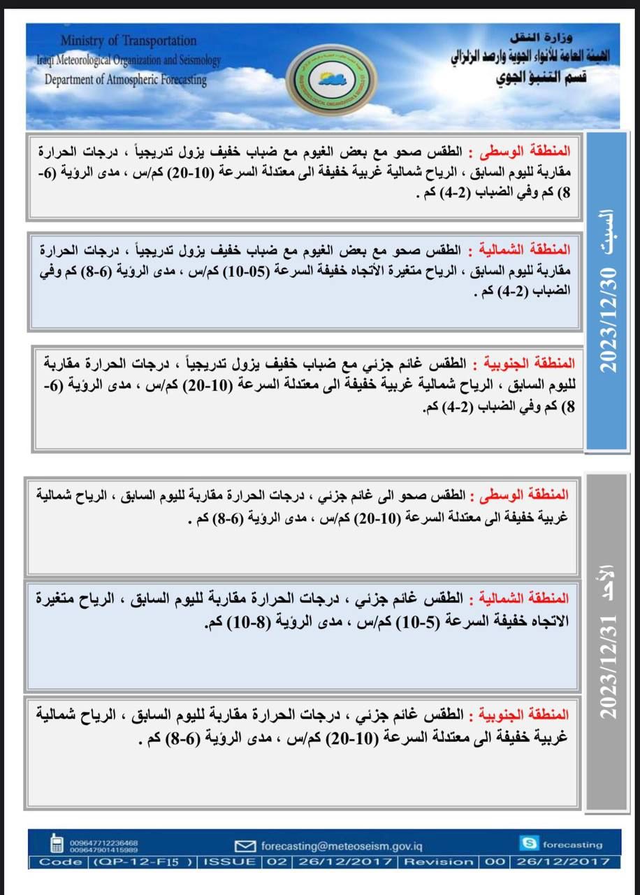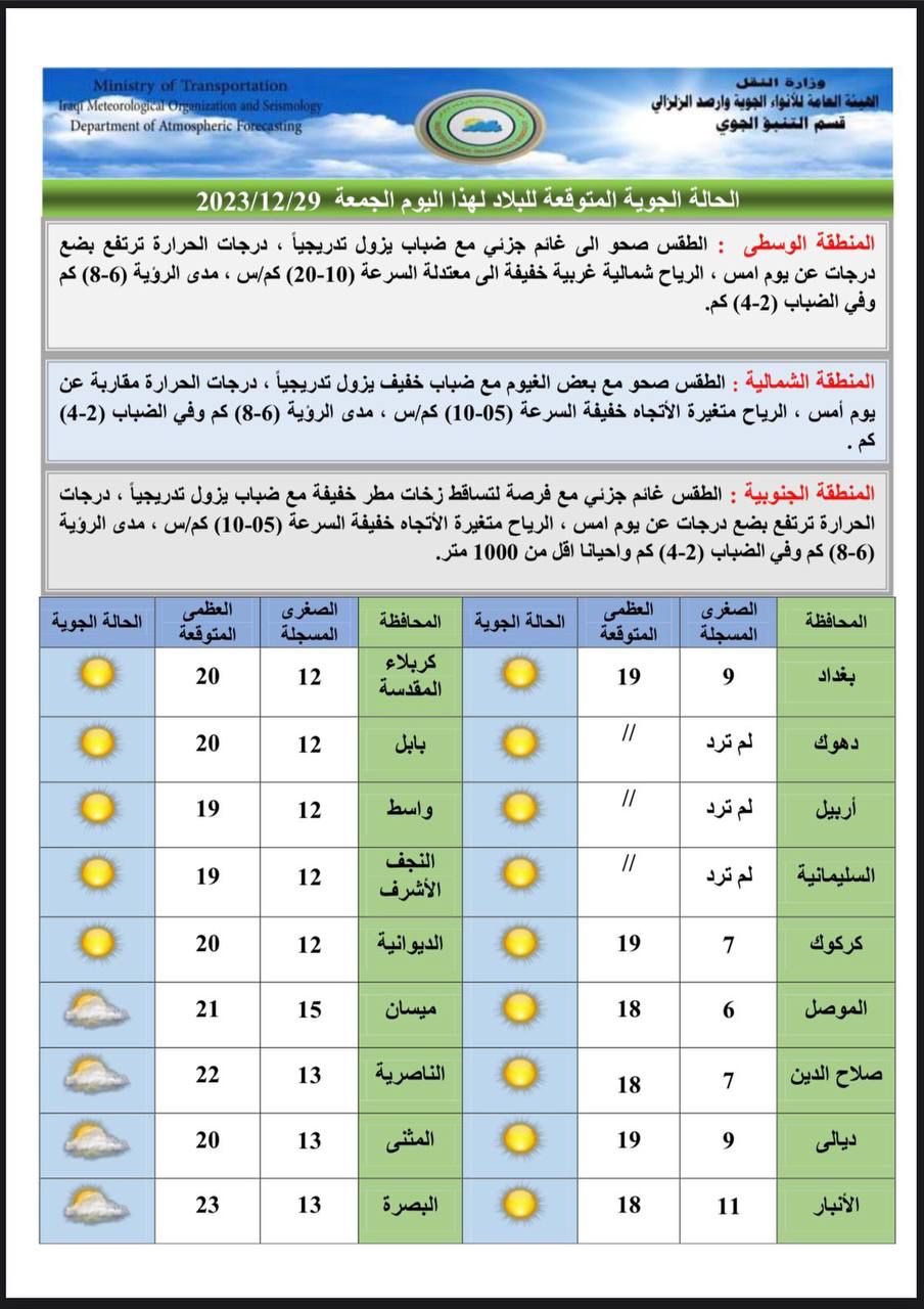 قراءة: طقس العراق.. اجواء غائمة وتصاعد للضباب واستقرار درجات الحرارة