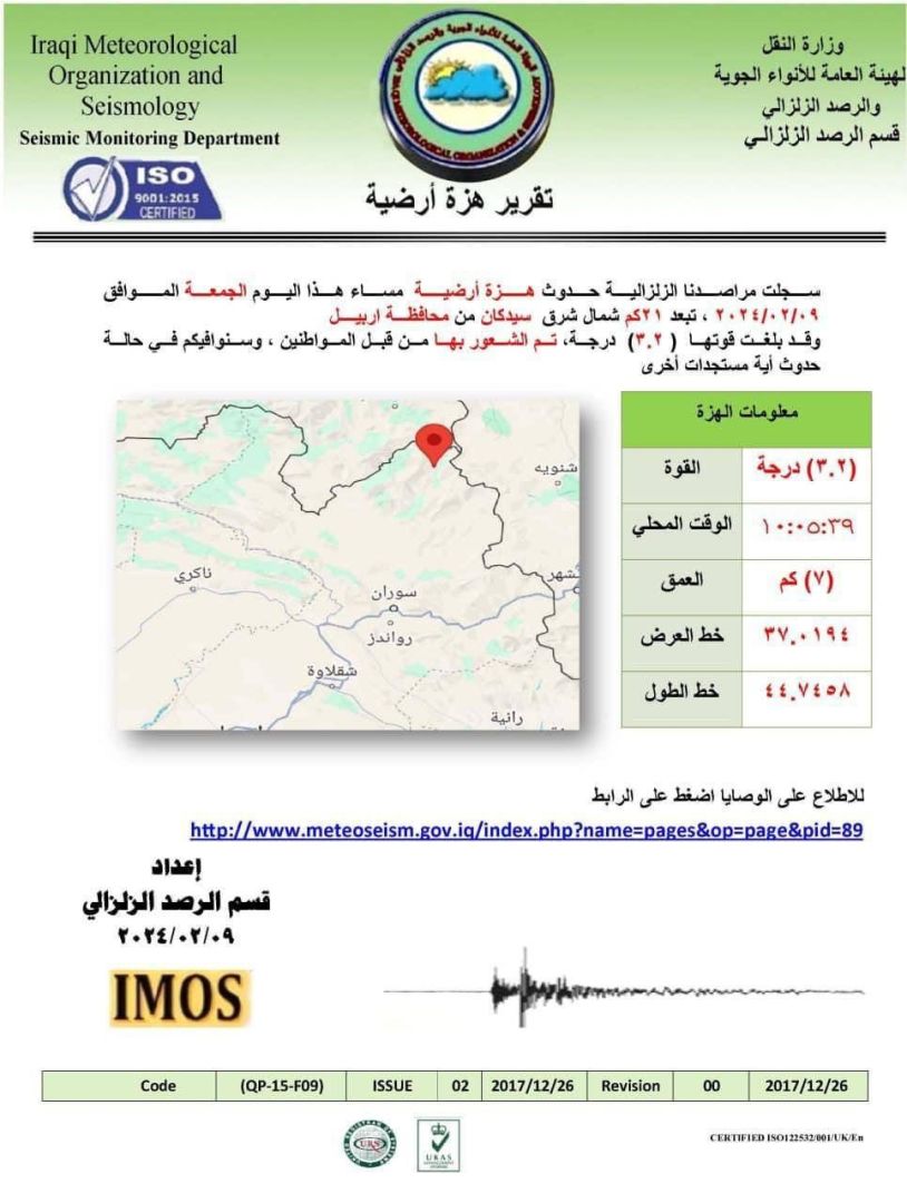 اعلنت وزارة النقل، تسجيل مراصدها الزلزالية في الهيئة العامة للانواء الجوية والرصد الزلزالي، حدوث هزة أرضية، الجمعة الموافق 9 شباط 2024 في محافظة اربيل .