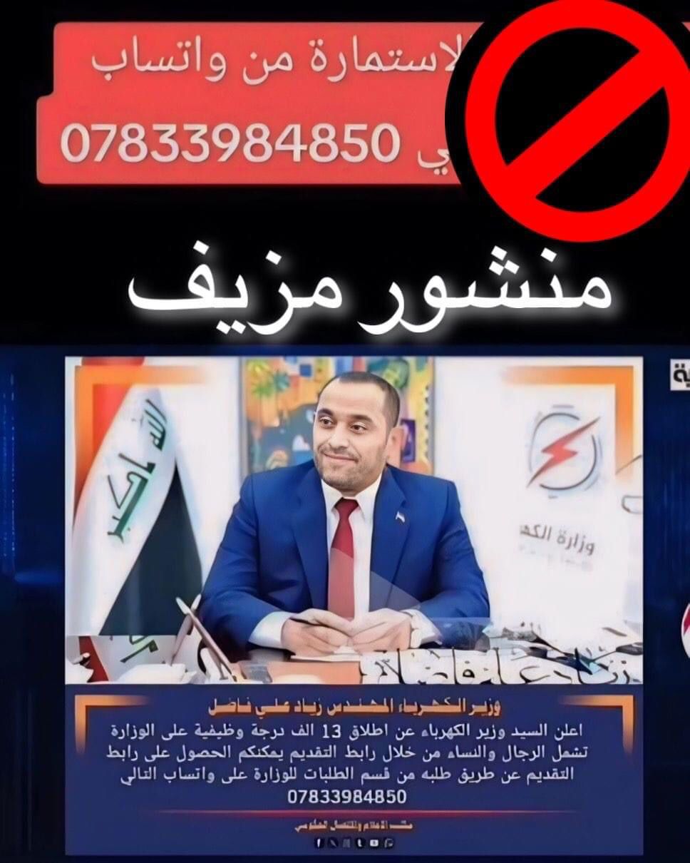 وذكرت الوزارة في بيان تلقته “الرشيد”، أن “المنشور المشار اليه هو (منشور مزيف)، ولا صحة له إطلاقاً، وأن جميع منشورات الوزارة المعتمدة تُنشر من خلال مواقع الوزارة الرسمية الموثقة، وصحفة وزير الكهرباء” .