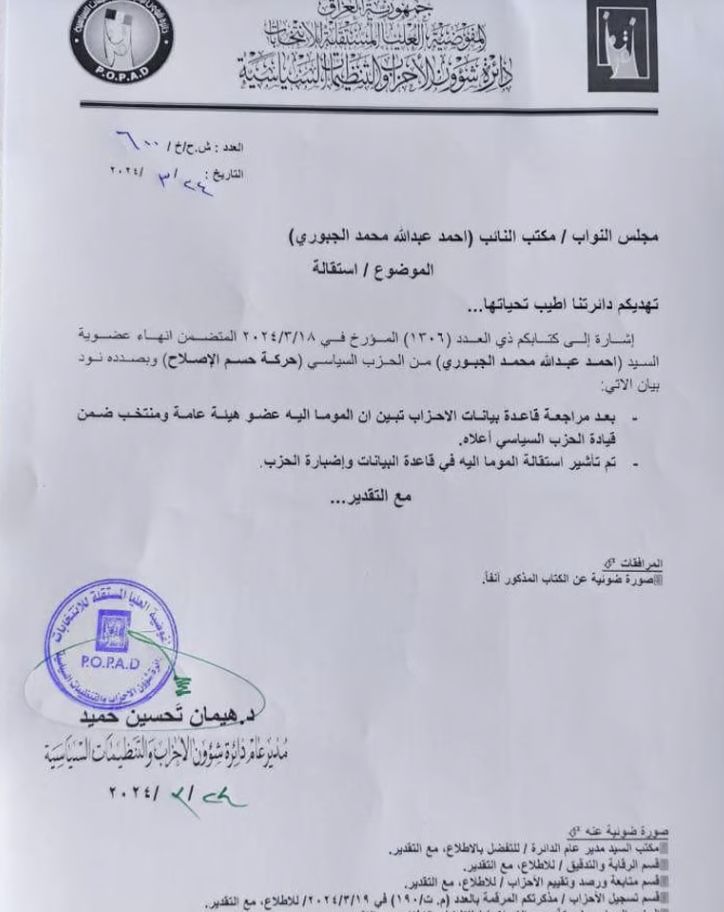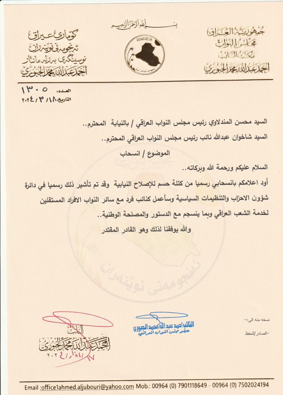 سياسةالجبوري يعلن انسحابه من كتلة “حسم” النيابية.. وثيقة قبل سنتين 7 مشاهدات شارك الجبوري يعلن انسحابه من كتلة "حسم" النيابية.. وثيقة الجبوري يعلن انسحابه من كتلة "حسم" النيابية.. وثيقة الجبوري يعلن انسحابه من كتلة "حسم" النيابية.. وثيقة الوسومالنائب احمد الجبوريقد يهمك أيضا أمن مصدر امني يكشف طبيعة الاشتباك المسلح شمال شرقي بغداد قبل 7 ساعات 34 مشاهدات أمن اشتباكات بين مجموعة مسلحة والقوات الامنية شمال شرقي بغداد قبل 8 ساعات 19 مشاهدات عربي ودولي ترامب: سنتخذ إجراءات قوية جدًا إذا أعدمت إيران محتجين قبل 8 ساعات 8 مشاهدات سياسة رئاسة الجمهورية تحذر من حملات تشهير عبر نشر معلومات خاطئة مع قرب التصويت على المرشحين قبل 9 ساعات 10 مشاهدات أمن الأعرجي ولاريجاني يؤكدان أهمية ضبط الحدود المشتركة ومنع تسلل المجموعات الإرهابية قبل 9 ساعات 18 مشاهدات