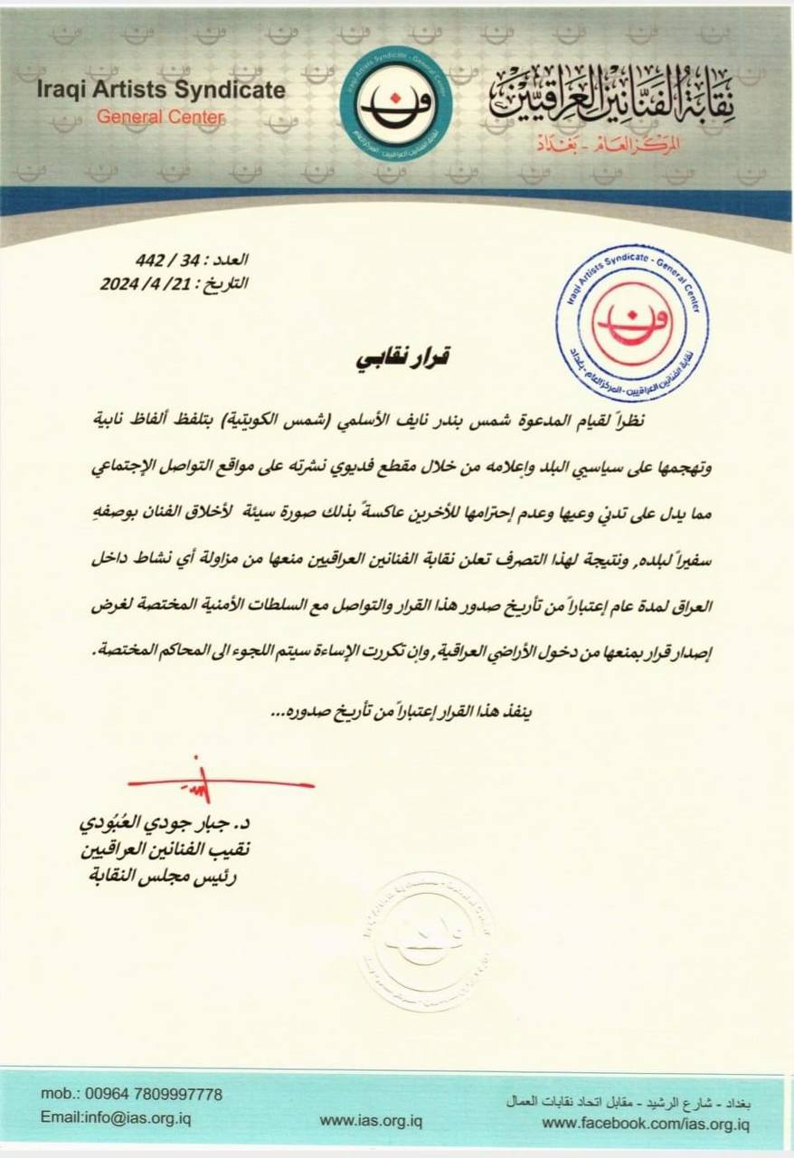 ثقافة وفننقابة الفنانين العراقيين تقرر منع الفنانة شمس الكويتية من مزاولة العمل الفني داخل العراق لمدة سنة كاملة قبل سنتين 23 مشاهدات شارك نقابة الفنانين العراقيين تقرر منع الفنانة شمس الكويتية من مزاولة العمل الفني داخل العراق لمدة سنة كاملةنقابة الفنانين العراقيين تقرر منع الفنانة شمس الكويتية من مزاولة العمل الفني داخل العراق لمدة سنة كاملة الوسومشمس الكويتيةنقابة الفنانين العراقيينقد يهمك أيضا عربي ودولي إيران تصادر ناقلة نفط تحمل 6 ملايين لتر في خليج عمان قبل 6 ساعات 17 مشاهدات عربي ودولي موسكو: مصادرة الأصول الروسية تطلق برنامج التدمير الذاتي للاتحاد الأوروبي قبل 6 ساعات 9 مشاهدات رياضة منتخب الإمارات يـتأهل لنصف نهائي كـأس العرب بعد تغلبه على الجزائر بركلات الترجيح قبل 6 ساعات 10 مشاهدات رياضة درجال معتذراً للجماهير عن الخروج من كأس العرب: اللاعبون سيعوضون ذلك في آذار المُقبل قبل 7 ساعات 9 مشاهدات رياضة إصابة يزن النعيمات بقطع في الرباط الصليبي قبل 7 ساعات 15 مشاهدات