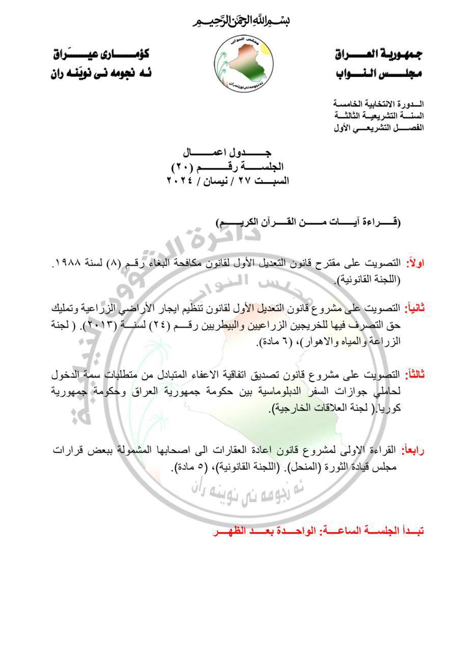 سياسةمجلس النواب ينشر جدول أعمال جلستي السبت والاثنين المقبلين قبل سنتين 1 مشاهدة شارك مجلس النواب ينشر جدول أعمال جلستي السبت والاثنين المقبلين مجلس النواب ينشر جدول أعمال جلستي السبت والاثنين المقبلين الوسوممجلس النوابقد يهمك أيضا محليات الدفاع المدني يتسلم دفعة جديدة من سيارات الإطفاء البريطانية قبل 26 دقيقة 5 مشاهدات أمن وزير العدل يشكل لجنةً تحقيقية بحادثة هروب نزيلين من سجن الأحداث قبل 54 دقيقة 10 مشاهدات عربي ودولي مصر بشأن إمكانية عقد لقاء بين السيسي ونتنياهو: شائعة لا أساس لها من الصحة مطلقاً قبل ساعة واحدة 6 مشاهدات أمن شرطة النجف تلقي القبض على أحد المتهمين الفارين من سجن الأحداث في بغداد قبل ساعتين 10 مشاهدات أمن مجهولون يقتلون شخصاً داخل أحد معارض السيارات في منطقة البياع ببغداد قبل ساعتين 14 مشاهدات