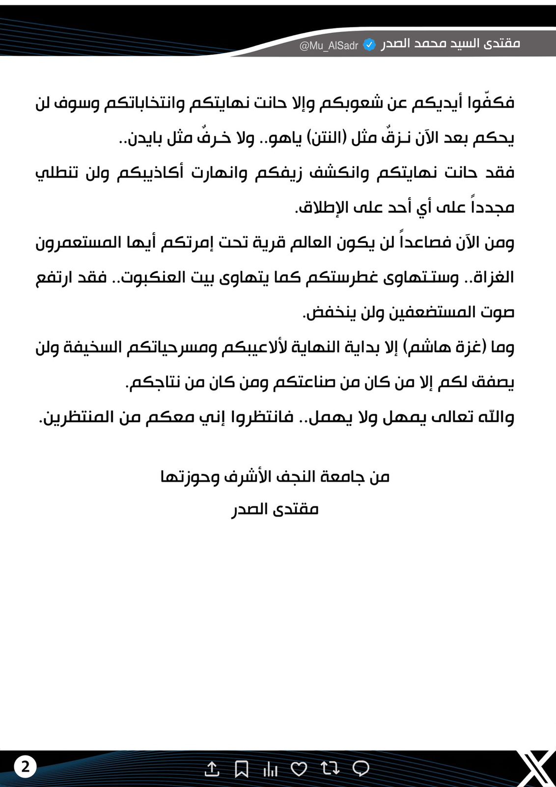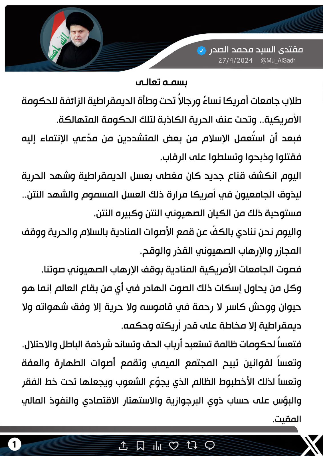 سياسةالسيد الصدر: صوت الجامعات الأمريكية المنادية بوقف الإرهاب الصهيوني صوتنا قبل سنتين 6 مشاهدات شارك السيد الصدر السيد الصدر بشأن الاحتجاجات بالجامعات الأمريكية: انكشف قناع كان مغطى بعسل الديمقراطية المسموم وشهد الحرية النتن السيد الصدر بشأن الاحتجاجات بالجامعات الأمريكية: انكشف قناع كان مغطى بعسل الديمقراطية المسموم وشهد الحرية النتن الوسومالصدرقد يهمك أيضا أمن السفير الروسي لدى بغداد يؤكد مقتل وإصابة مقاتلين عراقيين في الحرب الروسية الأوكرانية قبل ساعة واحدة 10 مشاهدات سياسة الجمعية العامة للأمم المتحدة تنتخب الرئيس العراقي السابق برهم صالح لمنصب المفوض السامي لشؤون اللاجئين قبل ساعة واحدة 8 مشاهدات أمن الإعلام الأمني تنوه: تنفيذ تمرين مشترك لفحص كفاءة وجاهزية الدفاعات الجوية صباح الغد قبل ساعة واحدة 11 مشاهدات رياضة رسميًا.. منتخبا السعودية والإمارات يتقاسمان برونزية كأس العرب بقرار من الفيفا قبل ساعتين 8 مشاهدات محليات العمل: كشف أكثر من 380 ألف أسرة متجاوزة على إعانة الحماية الاجتماعية بينهم ميسورو الحال قبل ساعتين 12 مشاهدات