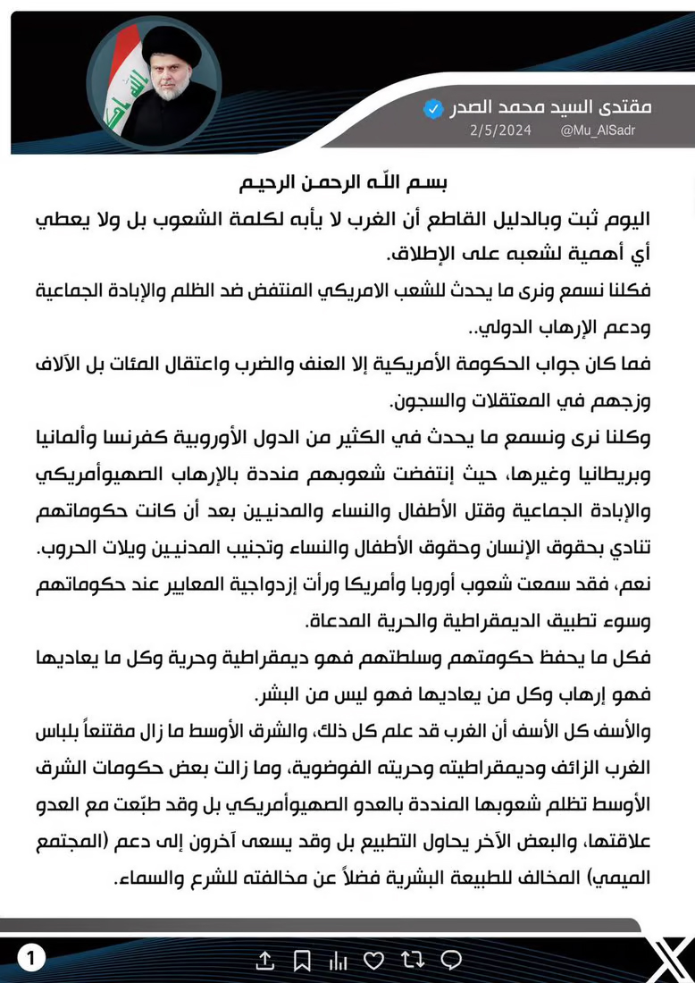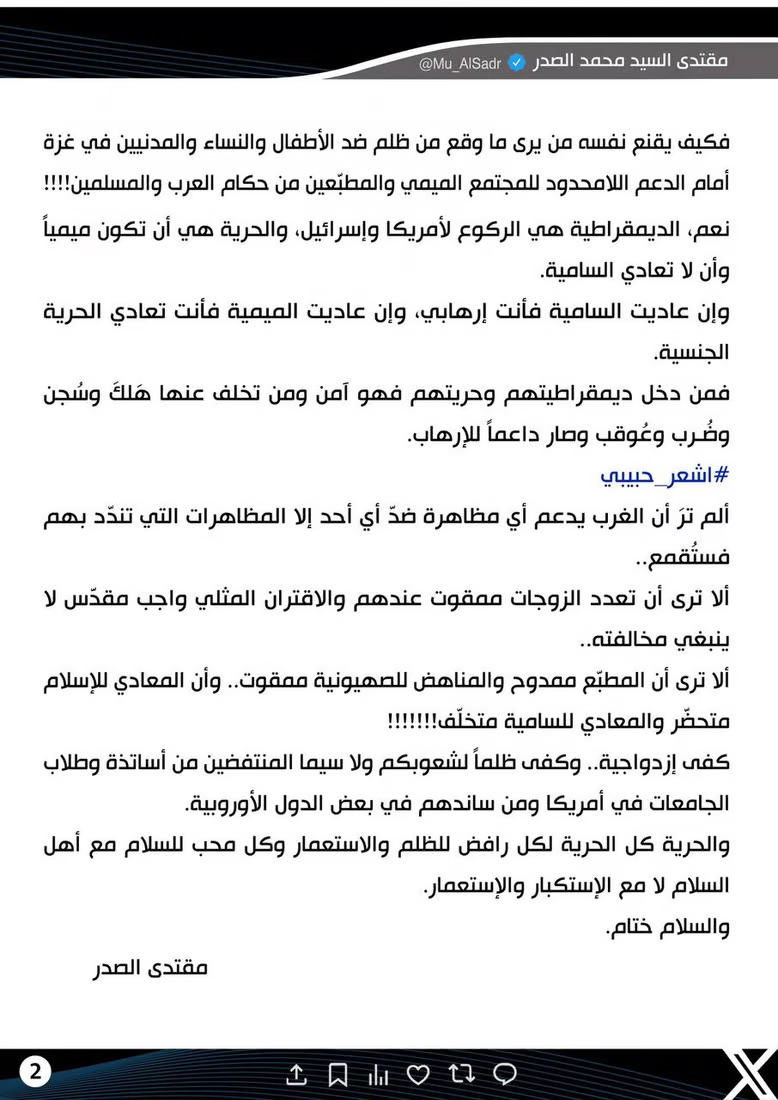 سياسةالسيد مقتدى الصدر يعلق على الاحتجاجات في الولايات المتحدة قبل سنتين 11 مشاهدات 1 شارك السيد مقتدى الصدر السيد مقتدى الصدر يعلق على الاحتجاجات في الولايات المتحدة السيد مقتدى الصدر يعلق على الاحتجاجات في الولايات المتحدة الوسومالصدرقد يهمك أيضا أمن السفير الروسي لدى بغداد يؤكد مقتل وإصابة مقاتلين عراقيين في الحرب الروسية الأوكرانية قبل ساعة واحدة 10 مشاهدات سياسة الجمعية العامة للأمم المتحدة تنتخب الرئيس العراقي السابق برهم صالح لمنصب المفوض السامي لشؤون اللاجئين قبل ساعة واحدة 8 مشاهدات أمن الإعلام الأمني تنوه: تنفيذ تمرين مشترك لفحص كفاءة وجاهزية الدفاعات الجوية صباح الغد قبل ساعة واحدة 11 مشاهدات رياضة رسميًا.. منتخبا السعودية والإمارات يتقاسمان برونزية كأس العرب بقرار من الفيفا قبل ساعتين 8 مشاهدات محليات العمل: كشف أكثر من 380 ألف أسرة متجاوزة على إعانة الحماية الاجتماعية بينهم ميسورو الحال قبل ساعتين 12 مشاهدات