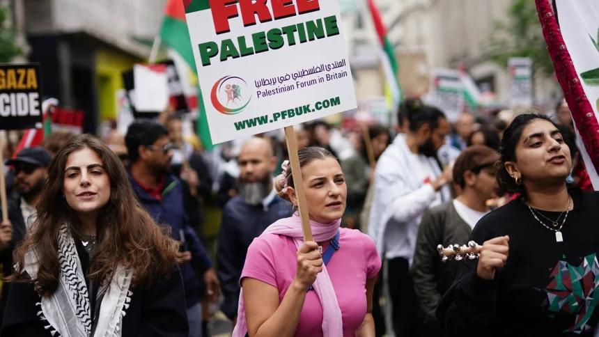 انطلقت اليوم السبت مسيرة وطنية للتضامن مع فلسطين من وسط لندن باتجاه مقر الحكومة البريطانية للمطالبة بوقف فوري لإطلاق النار في غزة والضغط على الحكومة البريطانية لوقف تراخيص مبيعات الأسلحة لإسرائيل.
