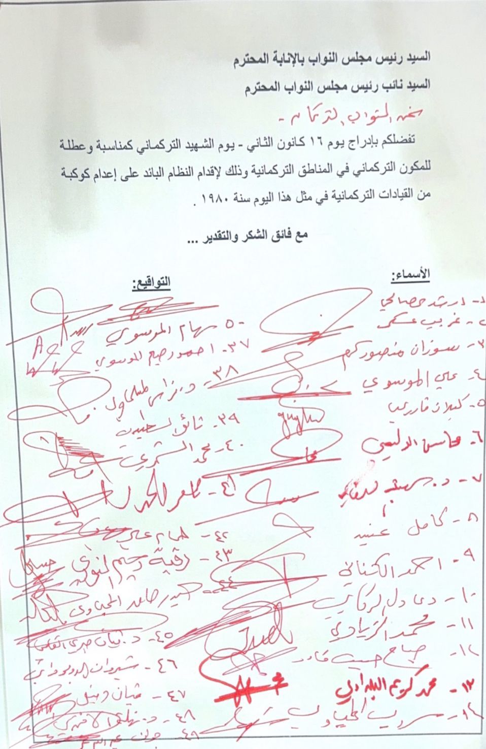 بالوثائق.. الجبهة التركمانية تجمع تواقيعا نيابية لاعتبار "يوم الشهيد التركماني" عطلة رسمية