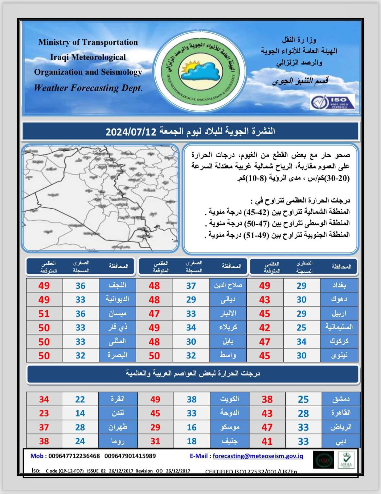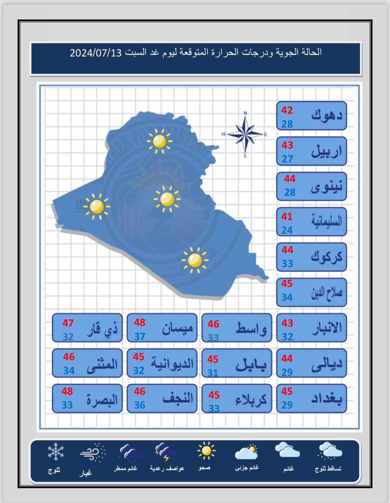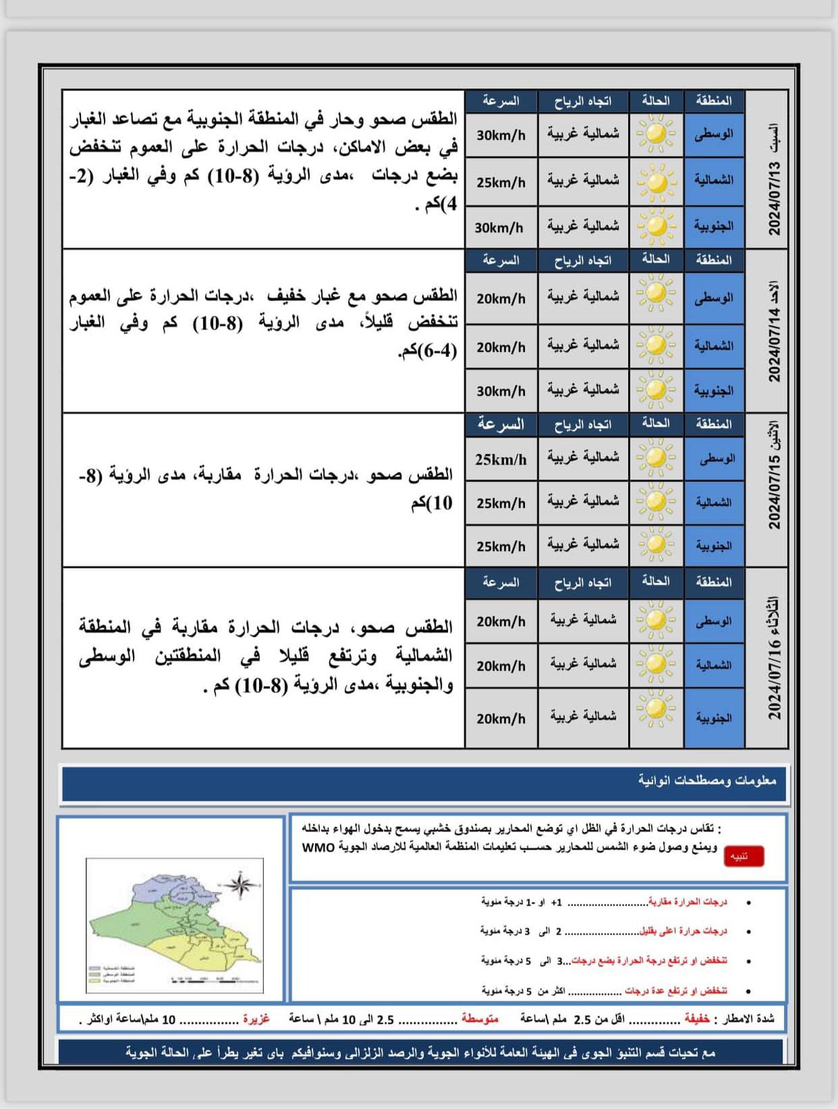 أعلنت هيئة الأنواء الجوية، حالة طقس العراق خلال الايام المقبلة، فيما اشارت إلى انخفاض في درجات الحرارة خلال الأيام المقبلة.