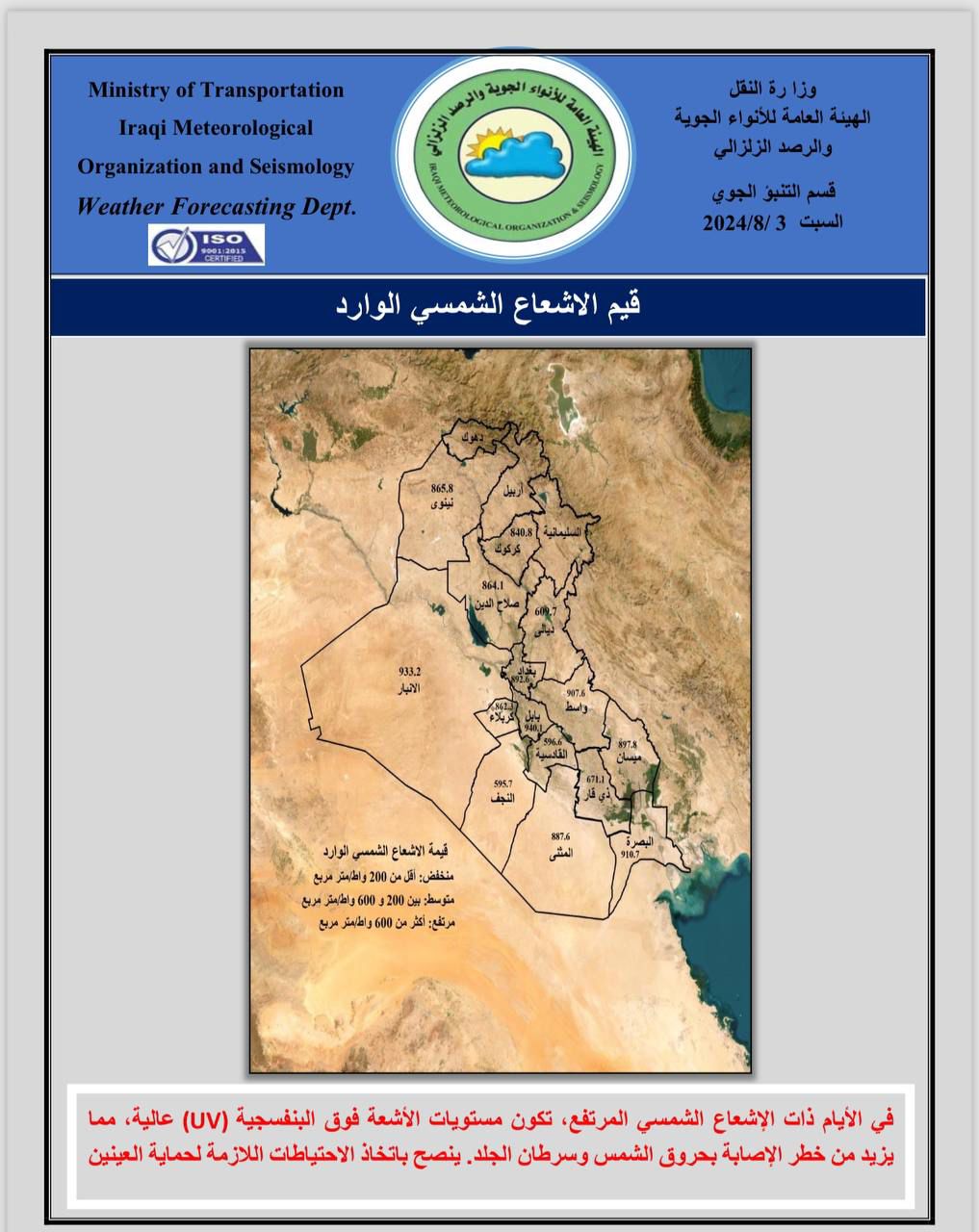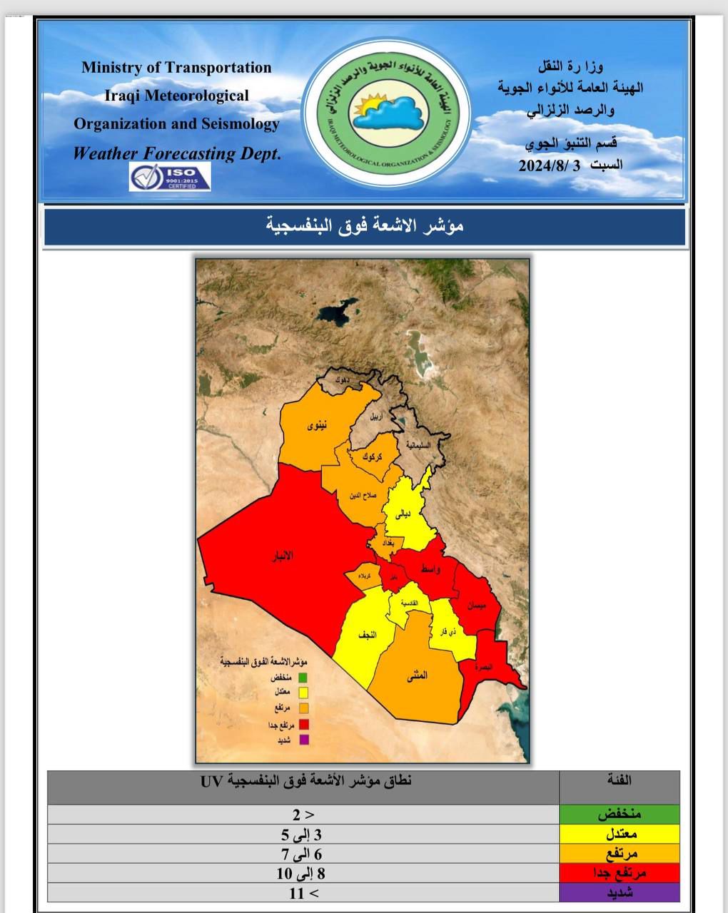 محلياتمرتفعة بخمس محافظات ومعتدلة بأربع أخرى.. الرشيد تنشر مؤشر الأشعة فوق البنفسجية في العراق قبل سنة واحدة 14 مشاهدات شارك مرتفعة بخمس محافظات ومعتدلة بأربع أخرى.. الرشيد تنشر مؤشر الأشعة فوق البنفسجية في العراق مرتفعة بخمس محافظات ومعتدلة بأربع أخرى.. الرشيد تنشر مؤشر الأشعة فوق البنفسجية في العراق الوسومالعراققد يهمك أيضا أمن اشتباك بين الاسايش وعناصر داعش ينتهي باعتقال 3 من التنظيم ضمن حدود حلبجة قبل 58 دقيقة 10 مشاهدات محليات وزيرة الاتصالات تقرر حجب لعبة "اللودو" قبل ساعة واحدة 24 مشاهدات محليات ديالى تعلن تعطيل الدوام الرسمي للمدارس فقط يوم غد الثلاثاء بسبب الظروف الجوية قبل ساعتين 8 مشاهدات محليات الأنواء الجوية توضح خارطة الأمطار: تستمر حتى الثلاثاء وذروتها في المناطق الشمالية قبل ساعتين 20 مشاهدات رياضة المغرب والسعودية تتأهلان لربع نهائي بطولة كأس العرب قبل 3 ساعات 10 مشاهدات