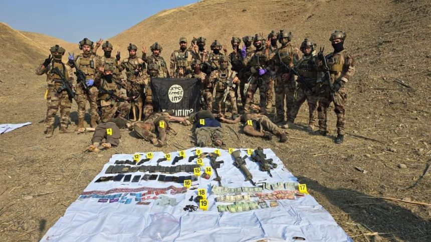 وأضاف أن “طائرات F_16 نفذت بالساعة الحادية والنصف من ليلة أمس ضربتين جويتين ناجحتين لاستهداف الوكر، وبالساعة 500 من صباح اليوم الثلاثاء خرجت قوة من أبطال جهاز مكافحة الإرهاب لتفتيش مكان الضربة وعثرت على (4) جثث لعصابات داعش أحدهم قيادي مهم”.
