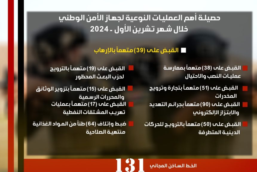 وذكر الجهاز في بيان تلقته الرشيد: إن “عملياتها الأمنية خلال شهر تشرين الأول أسفرت عن اعتقال (39) متهماً بالإرهاب و(51) تاجراً ومروجاً للمخدرات و(90) متهماً بالتهديد والابتزاز الإلكتروني و(50) متهماً ينتمون إلى الحركات الدينية المتطرفة، فضلاً عن عمليات نوعية أخرى نفذها الجهاز شملت مختلف محافظات البلاد”