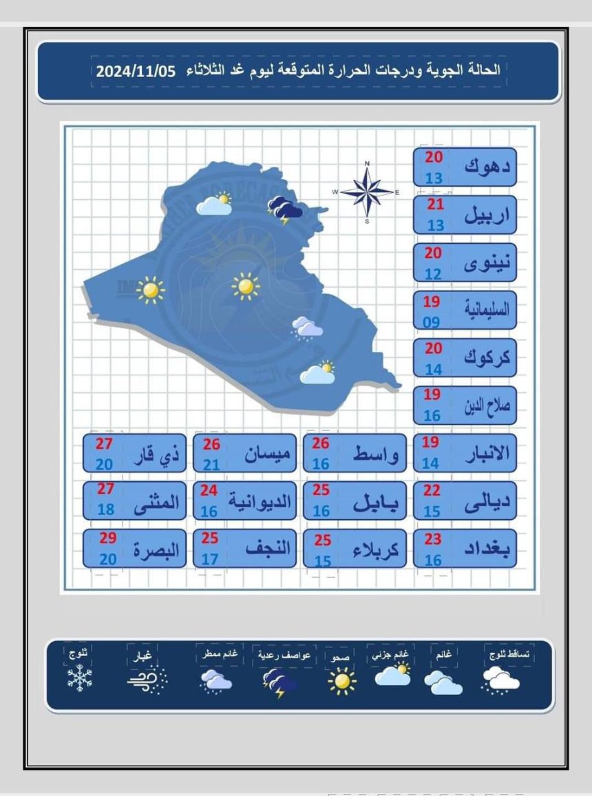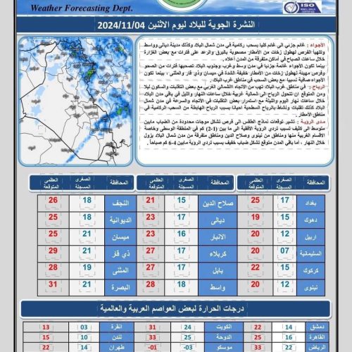 أعلنت هيئة الأنواء الجوية، حالة طقس العراق خلال الأيام المقبلة، فيما اشارت إلى استمرار الأمطار وتشكل الضباب.
