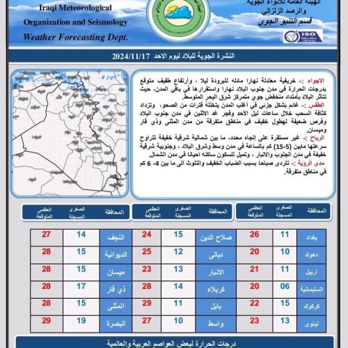 أعلنت هيئة الانواء الجوية، اليوم الاحد، حالة الطقس خلال الأيام المقبلة. وقالت الهيئة في بيانها ان درجات الحرارة ستنخفض وهناك تساقط للامطار في الشمال.