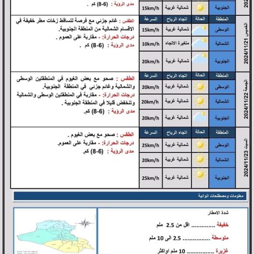 طقس العراق.. أمطار متفرقة وانخفاض بدرجات الحرارة خلال الأيام المقبلة