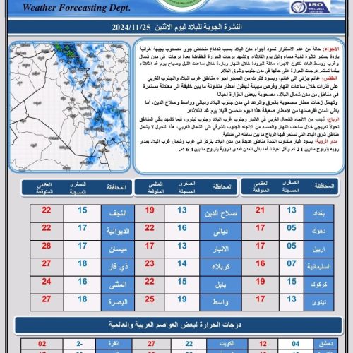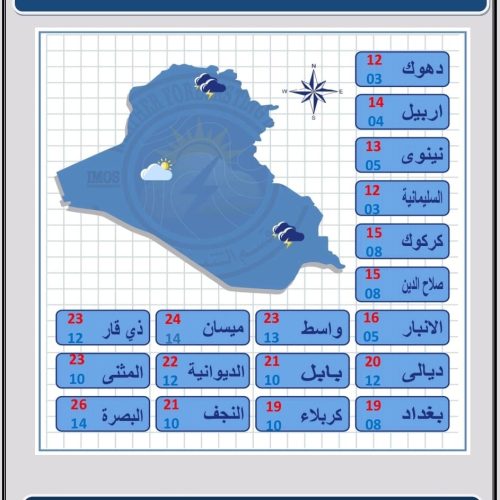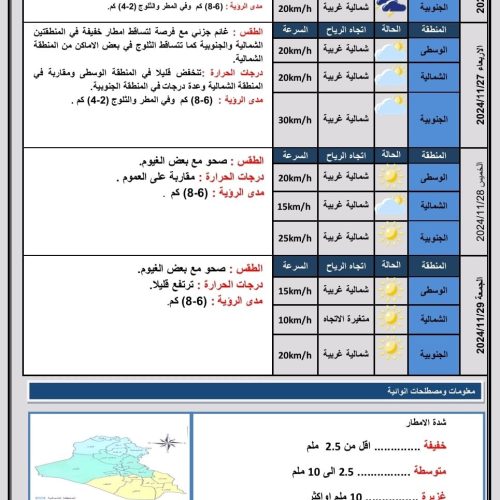 أعلنت هيئة الأنواء الجوية، حالة طقس العراق خلال الأيام المقبلة، فيما أشارت إلى هطول أمطار وتساقط الثلوج.