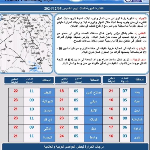 فيما توقعت ان يكون الطقس بحسب البيان غائم مع فرصة لهطول زخات مطرية وارتفاع بدرجات الحرارة.