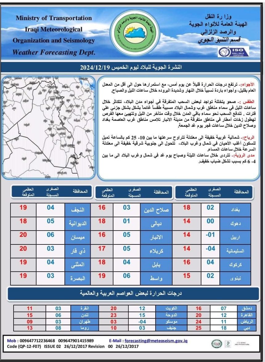 أعلنت هيئة الأنواء الجوية، حالة طقس العراق خلال الأيام المقبلة، فيما أشارت إلى أمطار رعدية وانخفاض درجات الحرارة خلال اليومين المقبلين.
