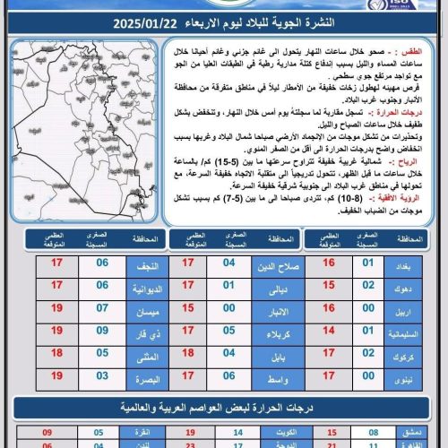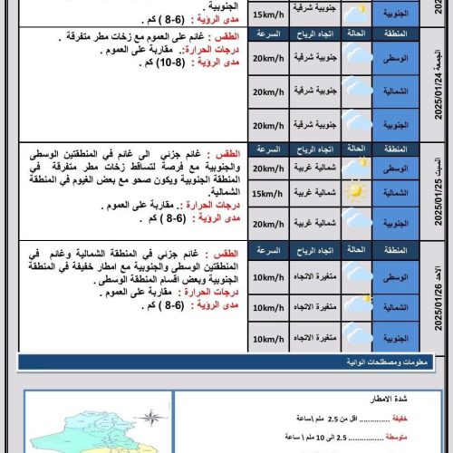أعلنت هيئة الأنواء الجوية، حالة طقس العراق خلال الأيام المقبلة، فيما أشارت إلى استقرار درجات الحرارة وفرصة لهطول أمطار.