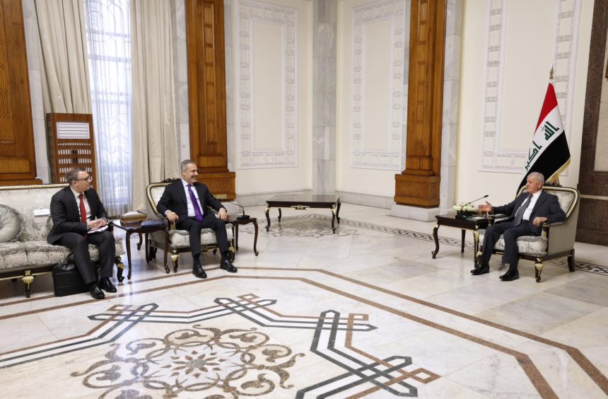 وذكرت الدائرة الإعلامية لرئاسة الجمهورية في بيان تلقته “الرشيد”، إن “رئيس الجمهورية عبد اللطيف جمال رشيد، استقبل في قصر بغداد، وزير الخارجية التركي هاكان فيدان والوفد المرافق له بحضور نائب رئيس مجلس الوزراء وزير الخارجية فؤاد حسين”.