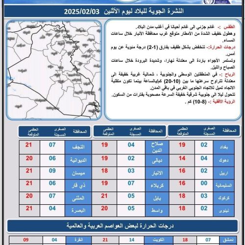 طقس العراق.. أمطار وتباين في درجات الحرارة خلال الأيام الأربعة المقبلة طقس العراق.. أمطار وتباين في درجات الحرارة خلال الأيام الأربعة المقبلة طقس العراق.. أمطار وتباين في درجات الحرارة خلال الأيام الأربعة المقبلة أعلنت هيئة الأنواء الجوية، حالة طقس العراق خلال الأيام المقبلة، فيما أشارت إلى أمطار وتباين في درجات الحرارة.