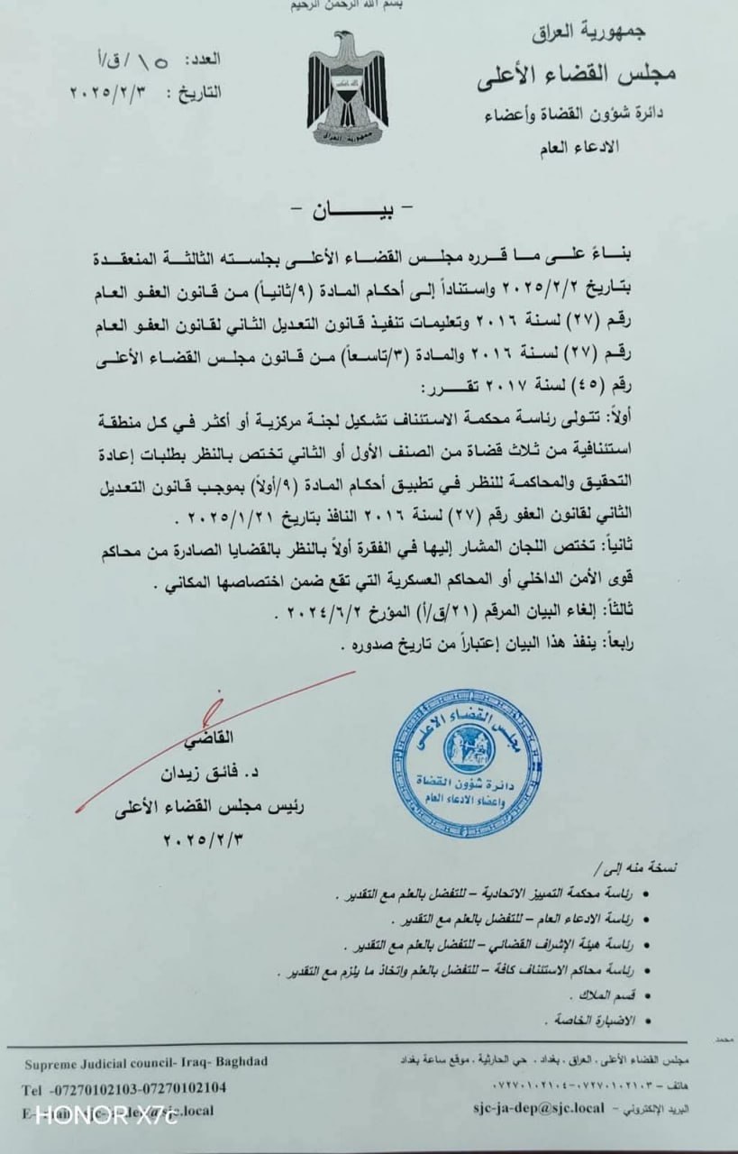 مجلس القضاء الأعلى يعمم تعليمات قانون العفو العام