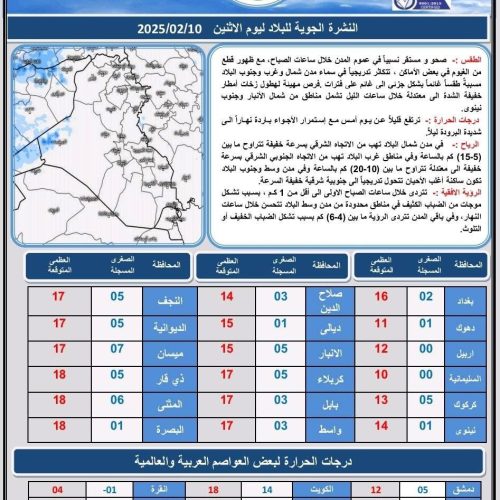 أعلنت هيئة الأنواء الجوية، حالة طقس العراق خلال الأيام المقبلة، فيما أشارت إلى أمطار وثلوج متفرقة وارتفاع درجات الحرارة.