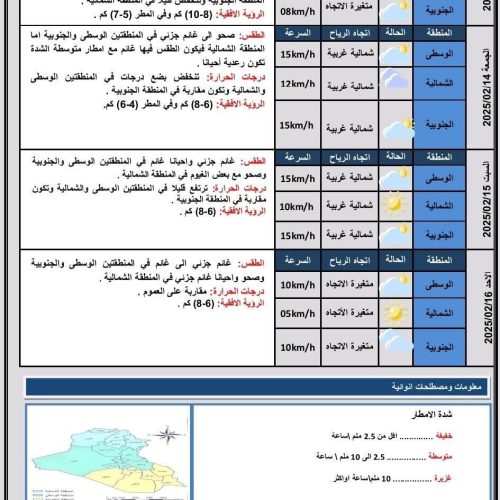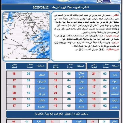 أعلنت هيئة الأنواء الجوية، حالة طقس العراق خلال الأيام المقبلة، فيما أشارت إلى أمطار رعدية وانخفاض درجات الحرارة خلال اليومين المقبلين.