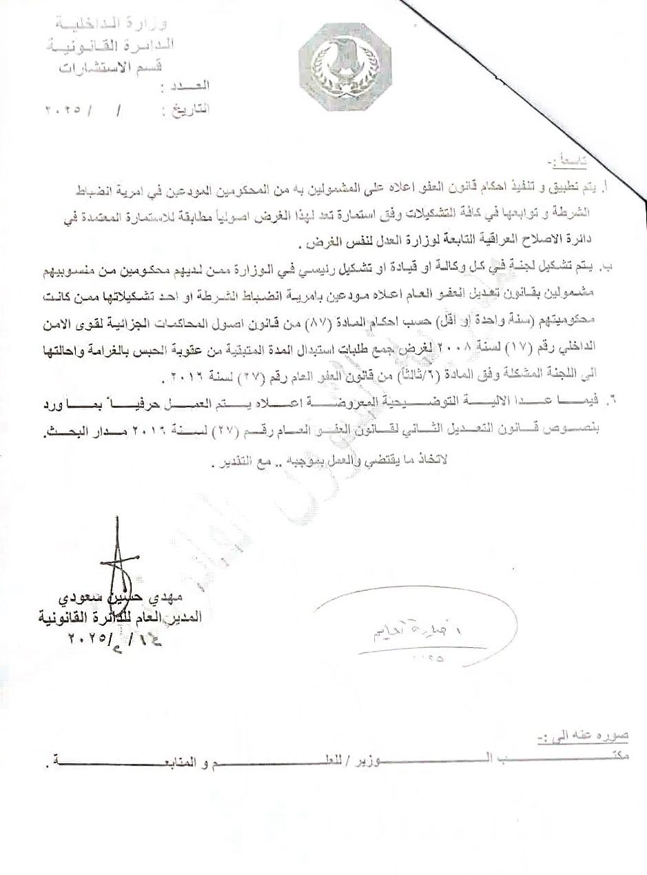 محلياتبالوثائق.. إجراءات تنفيذ قانون العفو العام قبل 10 أشهر 45 مشاهدات شارك بالوثائق.. إجراءات تنفيذ قانون العفو العامبالوثائق.. إجراءات تنفيذ قانون العفو العامبالوثائق.. إجراءات تنفيذ قانون العفو العامبالوثائق.. إجراءات تنفيذ قانون العفو العام الوسومالعفو العامبالوثائققانون العفو العامقد يهمك أيضا محليات اندلاع حريق داخل بناية متخذة كقاعة للاعراس في ساحة عنتر بمنطقة الاعظمية قبل ساعة واحدة 10 مشاهدات ثقافة وفن بعد مصرعها بحريق في منزلها.. مساعدة الفنانة "نيفين مندور" تزعم مقتلها وتطالب بالتحقيق قبل ساعتين 9 مشاهدات أمن احباط محاولة هروب سجين وسط العاصمة بغداد قبل 3 ساعات 10 مشاهدات أمن الاستخبارات العسكرية تطيح بـ18 متهماً بقضايا قانونية مختلفة في أربع محافظات قبل 3 ساعات 9 مشاهدات محليات القضاء يصدر إحصائية بحالات الزواج والطلاق خلال شهر تشرين الثاني الماضي قبل 3 ساعات 13 مشاهدات