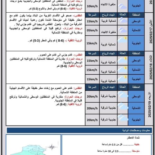 أعلنت هيئة الأنواء الجوية، اليوم السبت، عن تفاصيل حالة الطقس في البلاد للأيام المقبلة، فيما توقعت هطول أمطار رعدية وتساقطاً للثلوج وانخفاضاً في درجات الحرارة.