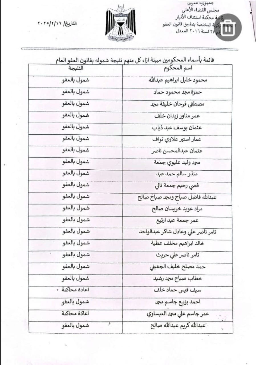 بالوثائق.. محكمة استئناف الانبار تعلن أسماء قسم من المشمولين بالعفو العام
