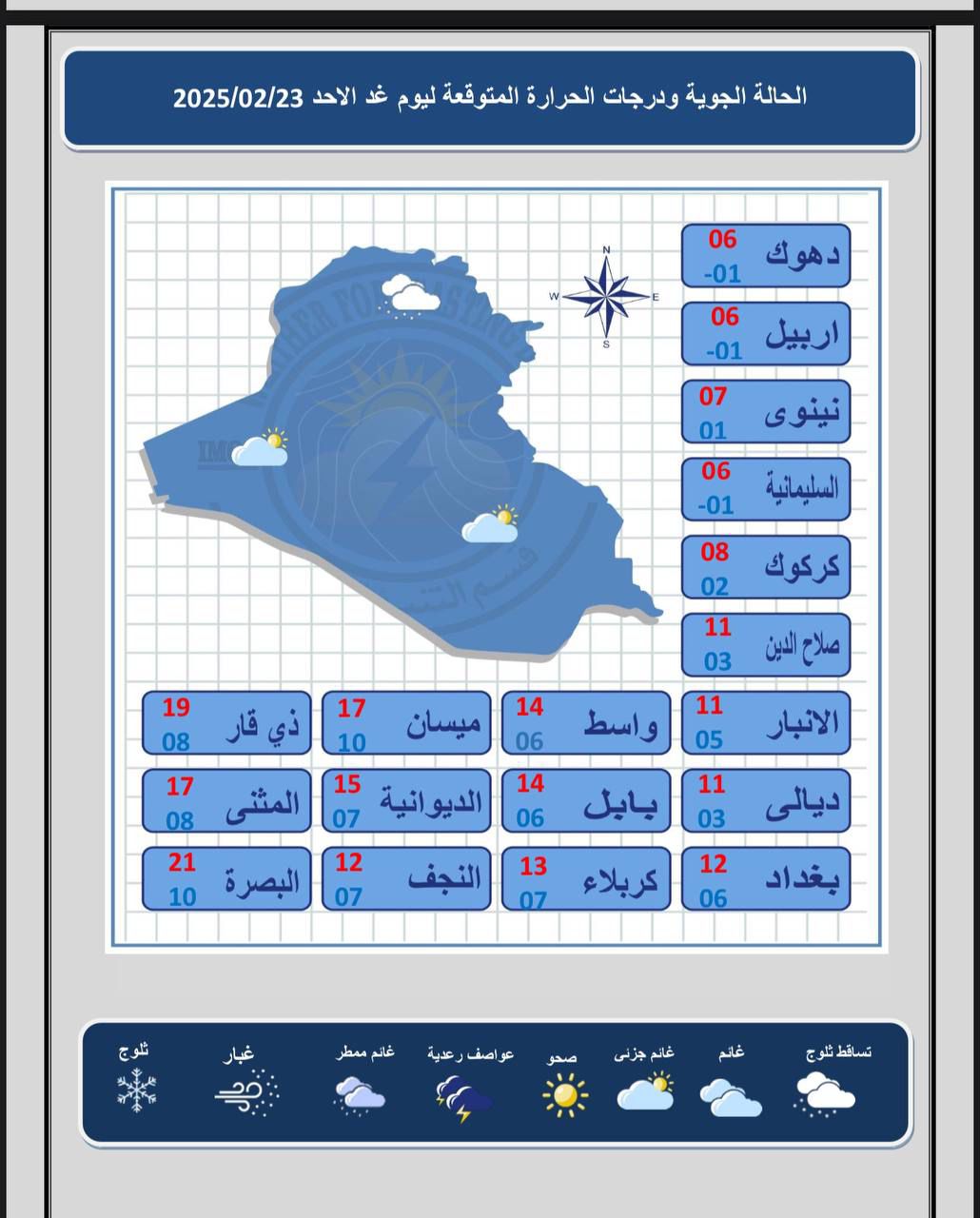 طقس العراق.. ثلوج وأمطار في الشمال وانخفاض درجات الحرارة بعموم البلاد خلال اليومين المقبلين قبل 10 أشهر شارك طقس العراق.. ثلوج وأمطار في الشمال وانخفاض درجات الحرارة بعموم البلاد خلال اليومين المقبلين