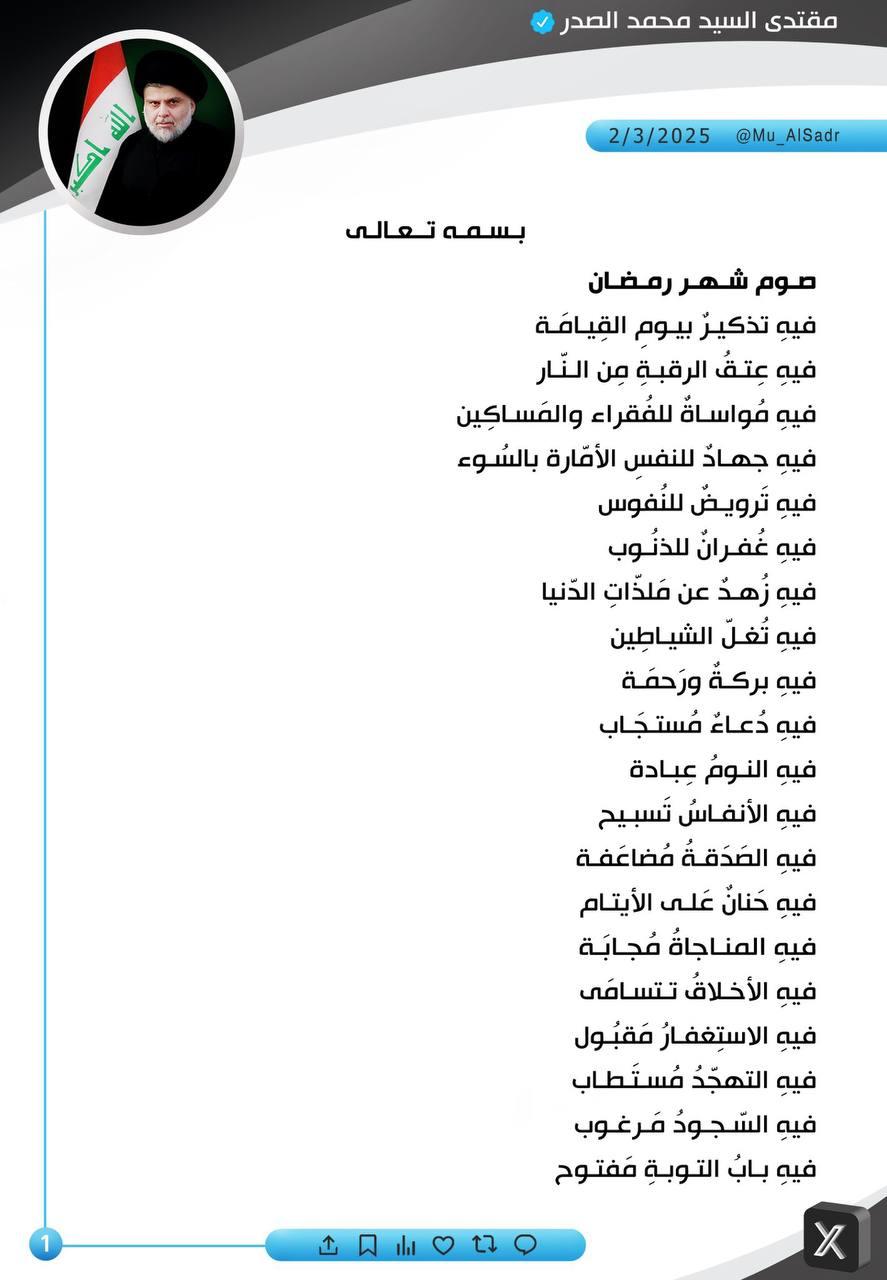 محلياتالسيد الصدر يدعو لغلق النوادي وصالات القمار ومراكز الرقص بالقانون ولو مؤقتاً قبل 9 أشهر 44 مشاهدات شارك السيد مقتدى الصدر السيد الصدر يدعو لغلق النوادي وصالات القمار ومراكز الرقص بالقانون ولو مؤقتاً السيد الصدر يدعو لغلق النوادي وصالات القمار ومراكز الرقص بالقانون ولو مؤقتاً الوسومالرقصالسيد الصدرصالات القمارقد يهمك أيضا عربي ودولي واشنطن: الأردن مستعد لتدريب القوات الأمنية الفلسطينية والسورية قبل 4 دقائق 3 مشاهدات رياضة أرنولد: مواجهة الجزائر تحدٍ كبير وهدفنا الوصول إلى نهائي البطولة قبل 37 دقيقة 7 مشاهدات سياسة النزاهة تعلن استردادها أكثر من (١٧) مليون دولار من عائدات الفساد قبل 46 دقيقة 6 مشاهدات رياضة مدرب الجزائر: منتخب العراق يلعب بشجاعة وهدفنا التأهل إلى الدور المقبل قبل 58 دقيقة 9 مشاهدات عربي ودولي الأمم المتحدة تواجه "أقسى أزمة تمويل" وتقلّص مساعداتها قبل ساعة واحدة 6 مشاهدات
