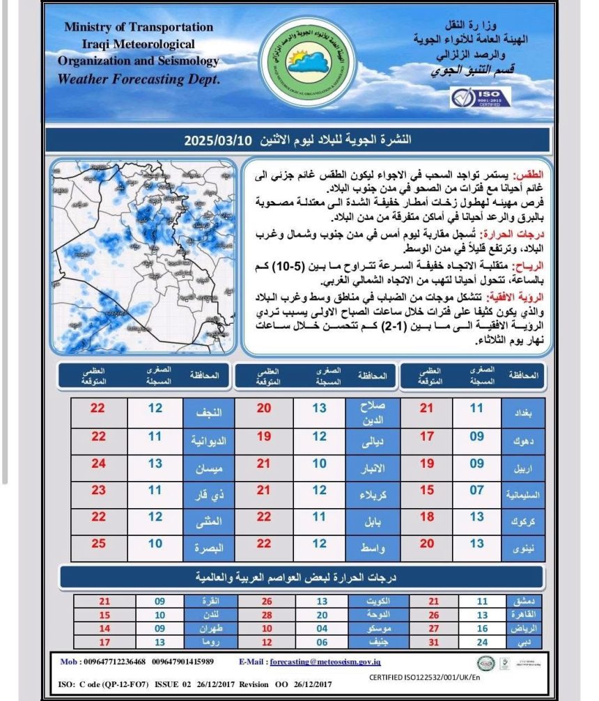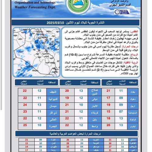 أعلنت هيئة الأنواء الجوية، حالة طقس العراق خلال الأيام المقبلة، فيما أشارت إلى صحو وارتفاع بدرجات الحرارة.